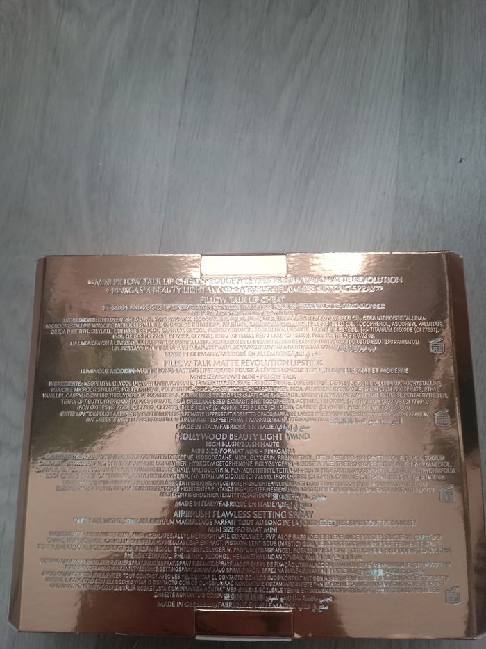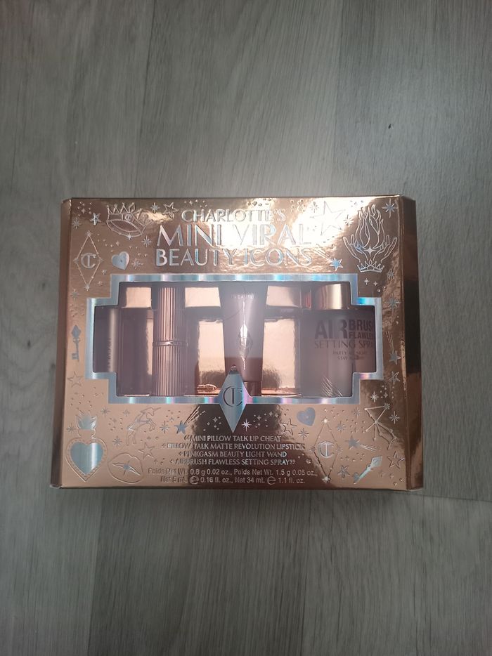 Coffret charlotte's mini viral beauty icons Mini pillow talk lip cheat 0.8g Crayon lèvres Pillow talk matte revolution 1.5g Rouge à lèvres lèvres Pink gasm beauty light wand 5ml Blush ou highlights Airbrush flawless setting spray 34ml Spray fixateur de maquillage Neuf jamais ouvert