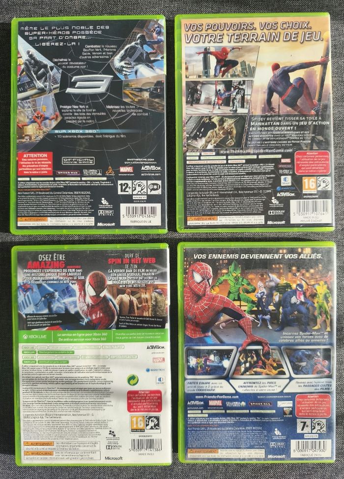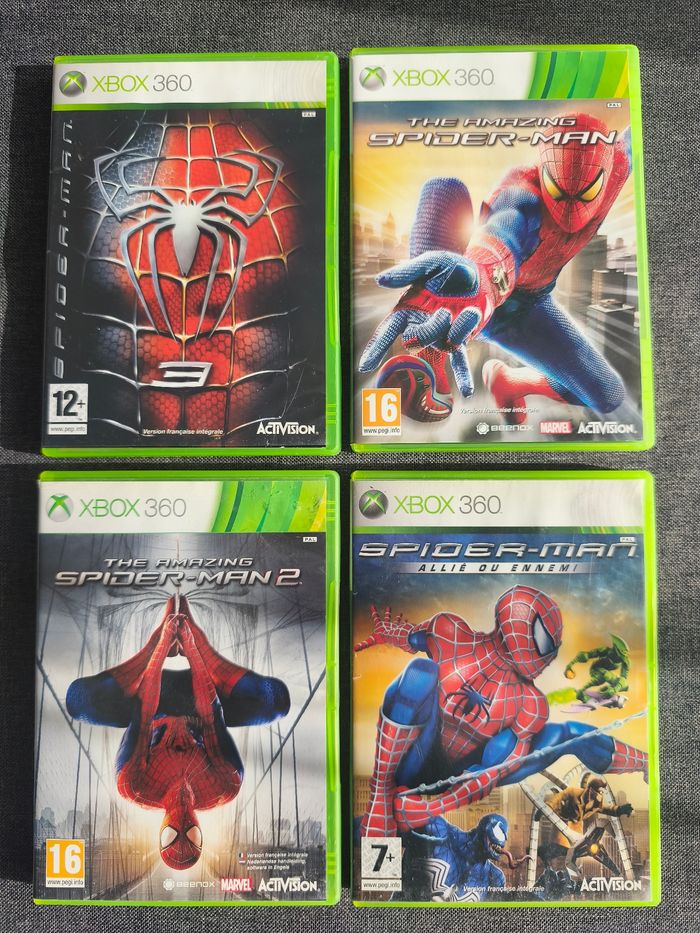 Je vends 4 jeux spiderman sur Xbox 360 en bon état Envoi rapide et soigné.