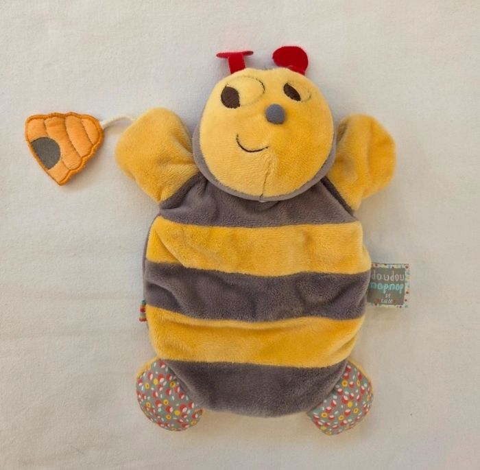 Lot de 2 doudous marionnettes Abeille Nopnop en velours de couleur jaune et gris rayé Ailes dans son dos en velours et velours poils de couleur blanc Attaché à sa main , une ruche