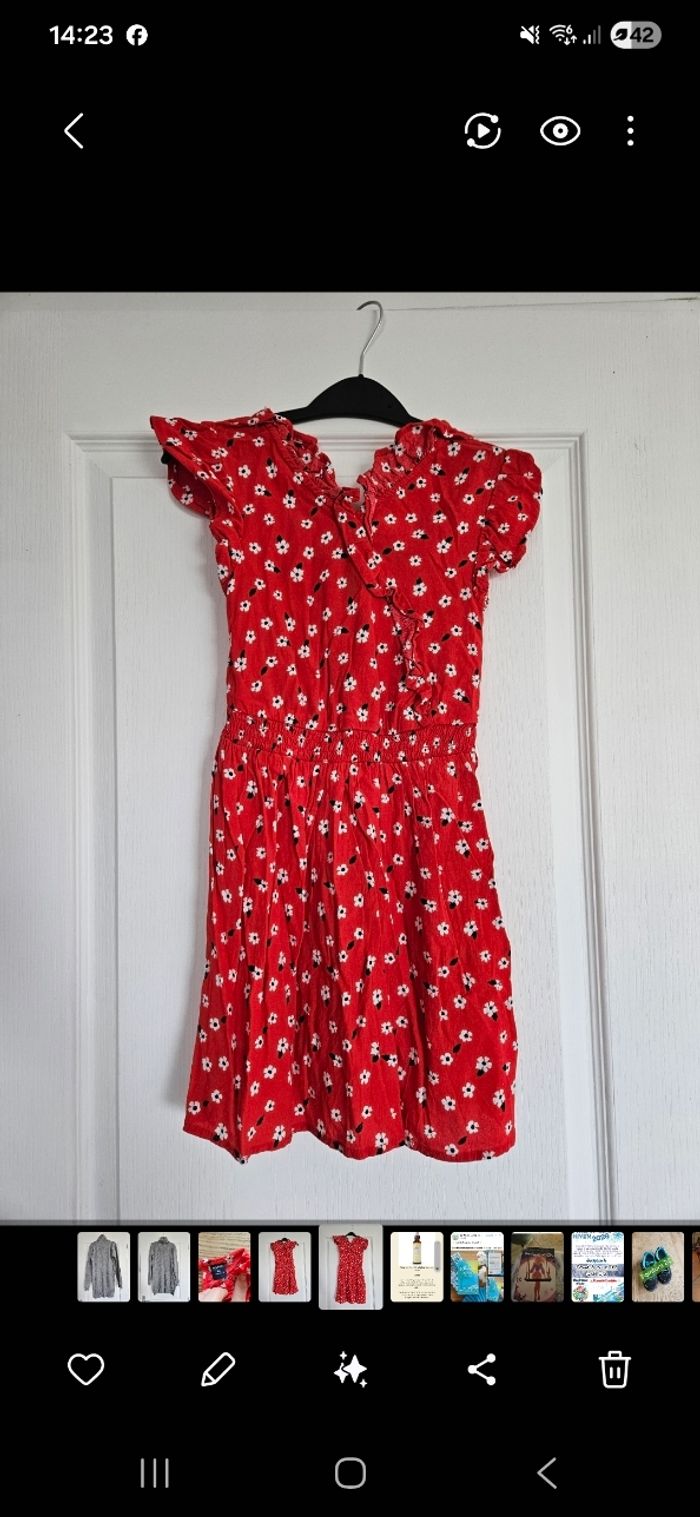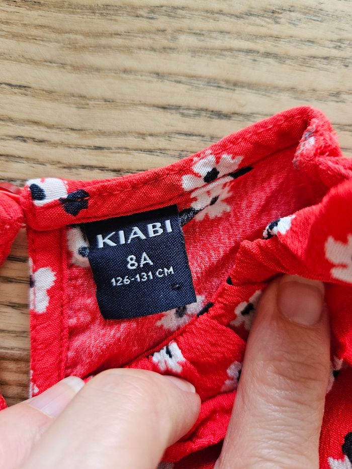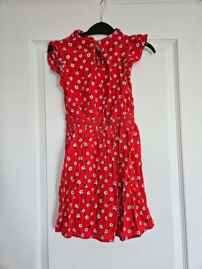 Robe rouge fleurie, matière fluide et légère. Se ferme par un bouton au niveau du dos. Taille 8 ans. En très bon état. Marque kiabi