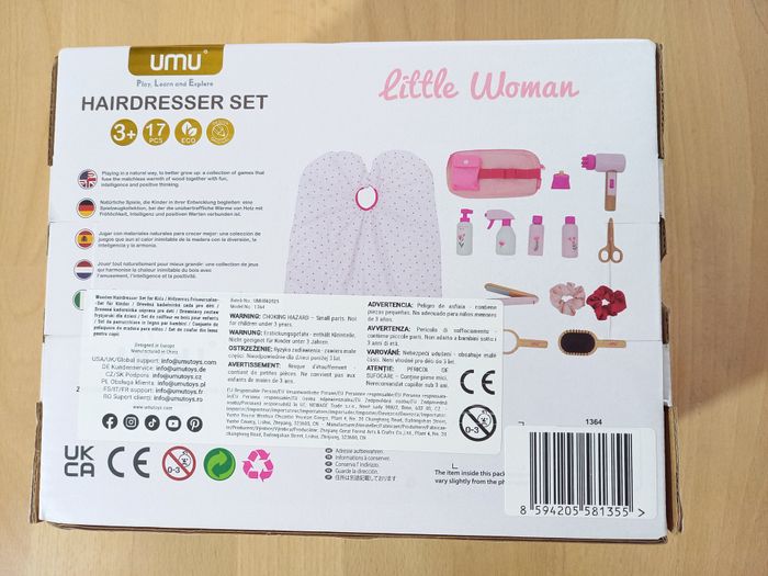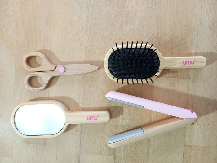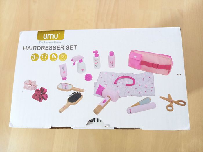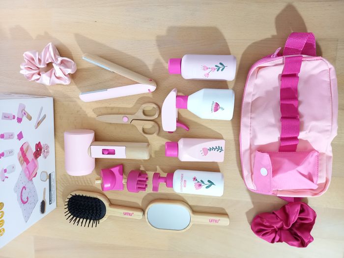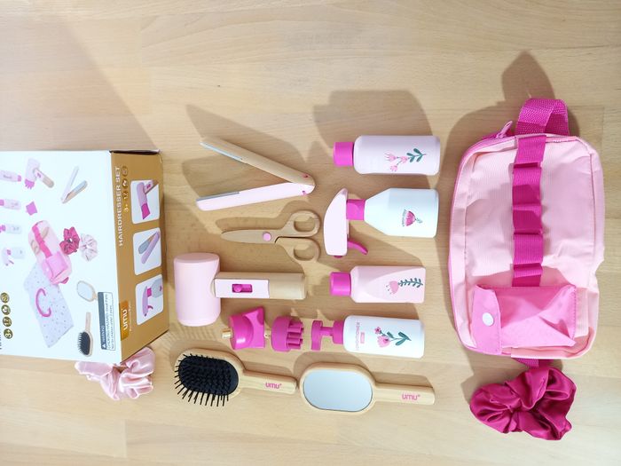 Adorable kit "Salon de coiffure" en bois pour enfant avec ceinture réglable. 🎀​ 🔍​ Description: ✨ Etat: Jamais utilisé 🏷️ ✨​ Style: Jeu d'imitation ✨​ Thème: Coiffure / imagination ✨​ Age: Dès 3 ans Autres jouets d'inspiration Montessori disponibles! ⚠️ Il ne s'agit pas de la marque Montessori mais d'un jeu s'inspirant de cette pédagogie. ✂️​ Kit de salon de coiffure 17 pièces pour enfants : le kit conçu avec soin comprend un sèche-cheveux, des ciseaux de coiffure, un miroir, une brosse, une laque, un shampoing, des produits de coiffure, un fer à lisser, un peigne, deux chouchous à cheveux, une ceinture de coiffure et une cape de coiffeur. ✨ Jeu de rôle créatif pour les petit(e)s stylistes : les enfants à partir de 3 ans peuvent créer leurs propres coiffures, servir les clients et se glisser dans le rôle d'un véritable coiffeur ou coiffeuse. Idéal pour les jeux imaginatifs seuls ou entre amis. 💇​ Avec ceinture de coiffure et cape de coiffeur: La ceinture réglable garantit que tous les outils de coiffure sont toujours à portée de main. Cette jolie cape de coiffeur au design floral délicat complète parfaitement l'expérience de coiffure. 🎁 Le cadeau parfait: Que ce soit pour un anniversaire, ou tout simplement comme surprise, cet ensemble favorise la motricité fine, les compétences sociales et la confiance en soi. 🌳 Qualité supérieure et finition sûre : toutes les pièces sont en bois solide, sont polies et peintes avec des peintures inoffensives. Cela crée des jouets durables et sûrs avec une attention particulière aux détails - Idéal pour les petites mains des enfants. 🚚 Pour une expédition (et une livraison) rapide, merci de privilégier Mondial Relay