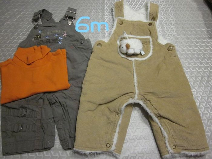 6m, ensemble 3 pièces + 2 salopettes + sous pull + gilet zippé + 2 pantalons + pull + chemise + pull sans manche