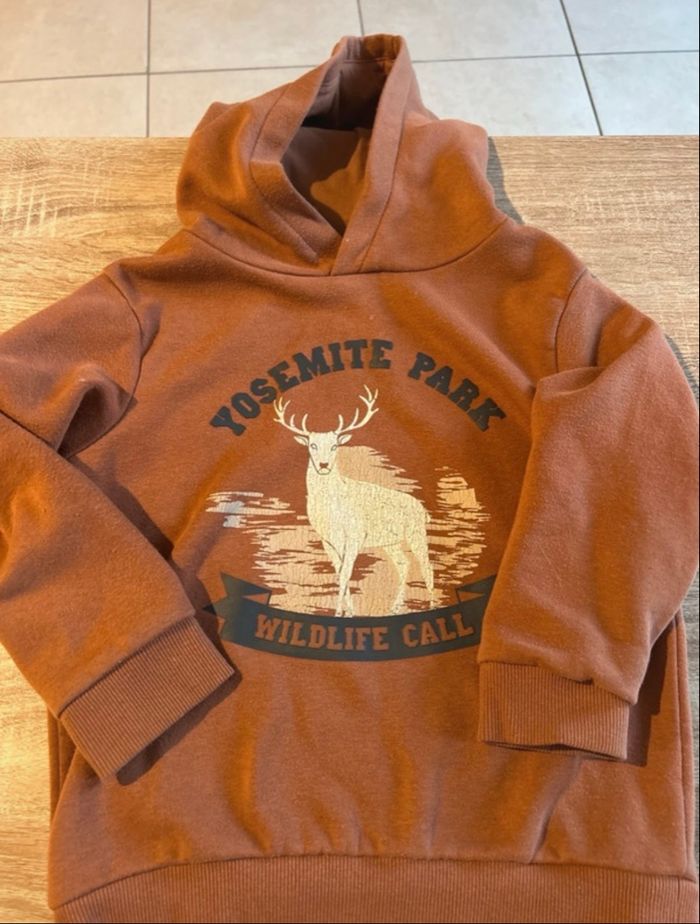 Taille : 4 ans Joli sweat à capuche couleur terracotta/marron avec motif cerf “Yosemite Park – Wildlife Call” sur le devant. Matière douce et confortable, idéal pour la mi-saison ou l’hiver. 🔹 Marque : Orchestra 🔹 État : bon état (usure normale liée au port, voir photos) 🔹 Capuche intégrée 🔹 Maison non fumeur