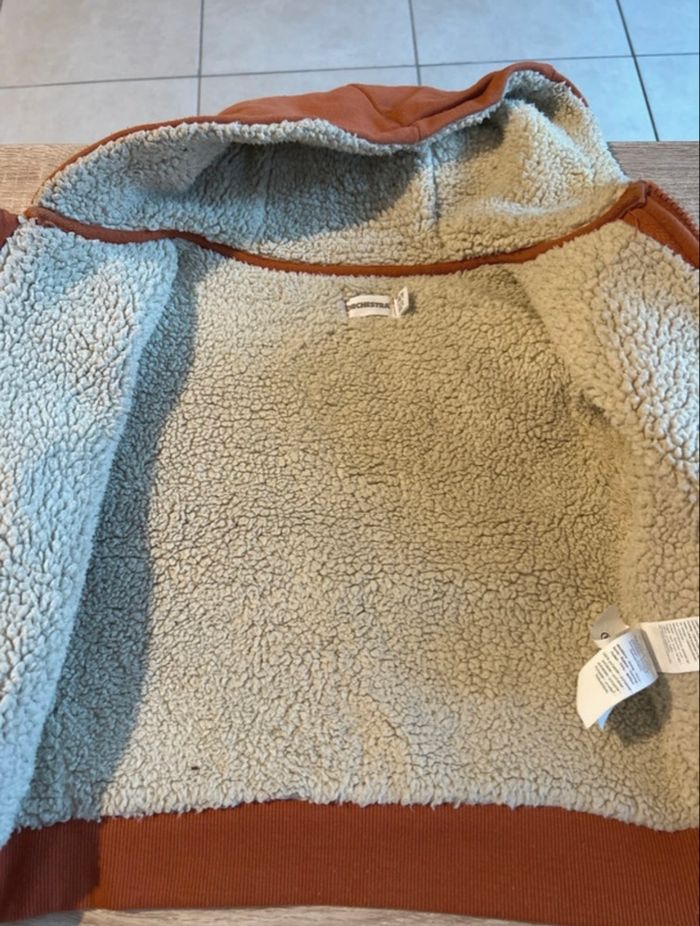 📏 Taille : 5 ans Veste chaude et confortable, idéale pour l’automne/hiver. Extérieur couleur terracotta, intérieur doublure mouton très douce. Capuche intégrée, fermeture zippée. 🔹 Marque : Orchestra 🔹 État : Bon état (pas de trou, pas de tache) 🔹 Maison non-fumeur