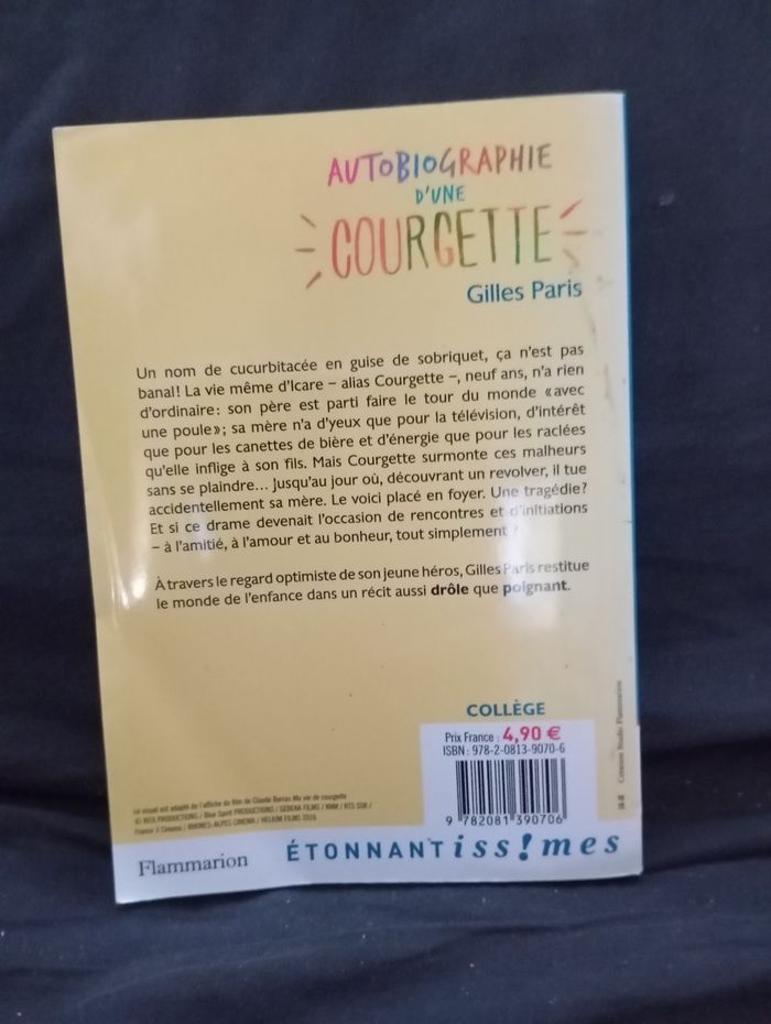 Je vends l'autobiographie "Autobiographie d'une courgette" de Gilles Paris. - Titre : Autobiographie d'une courgette - Auteur : Gilles Paris - Éditeur : Flammarion - Genre : Autre - Format : College Bon état N'hésitez pas à me contacter pour plus d'informations !