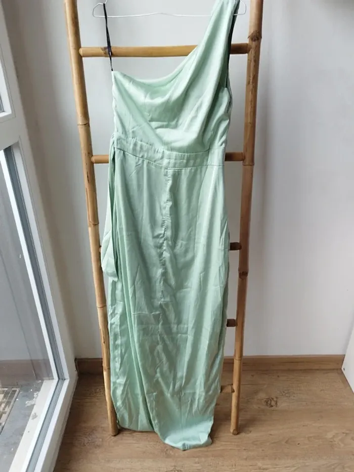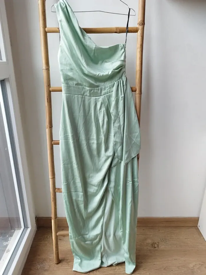 Robe longue asymétrique marque TFNC (site Asos). Couleur vert menthe, satin. Neuve avec étiquette, j'ai ajouté le tableau des tailles et la description du site pour référence. #dress #robeceremonie #cocktaildress #asosfashion #tfnclondon