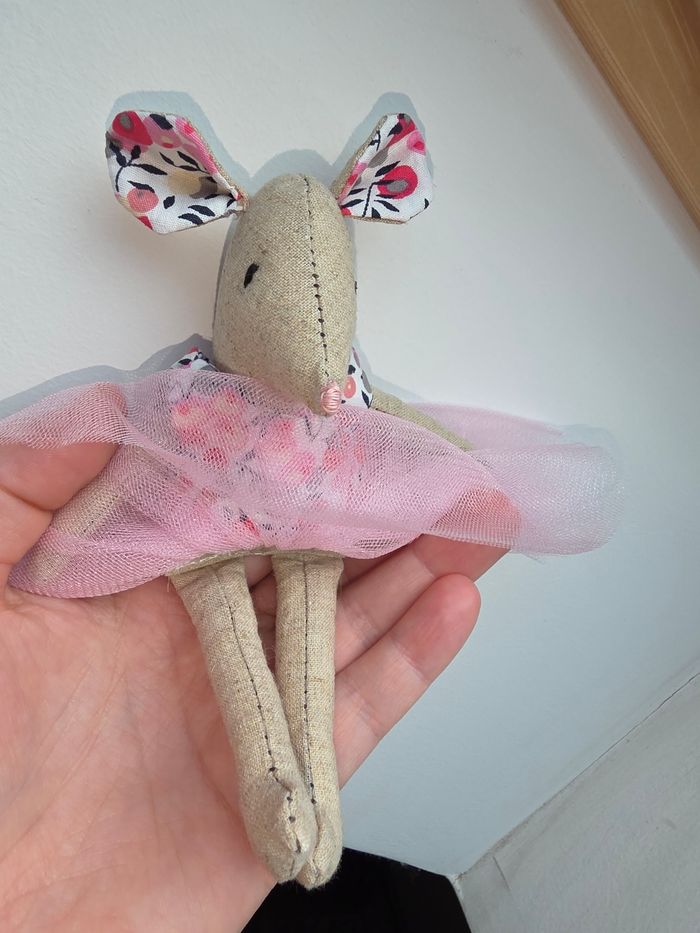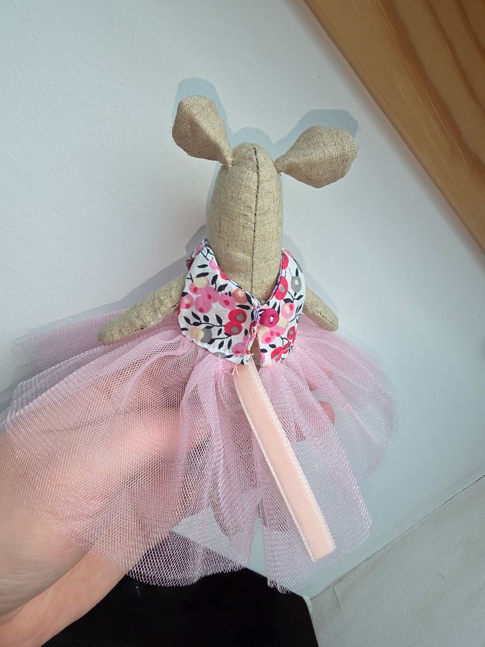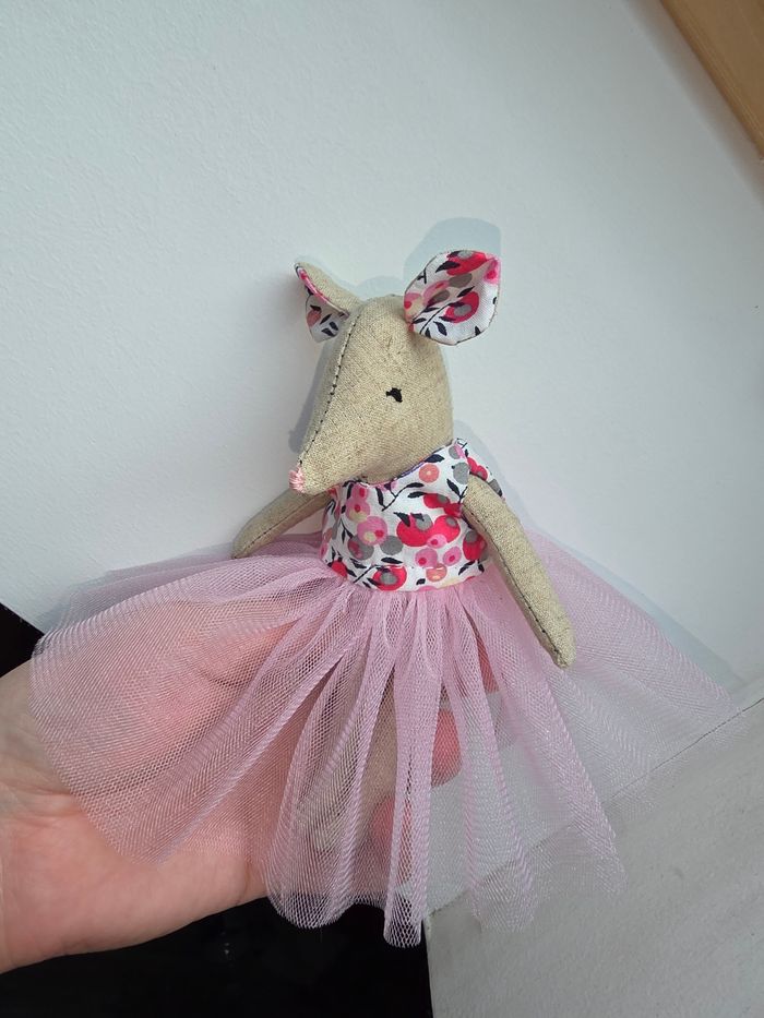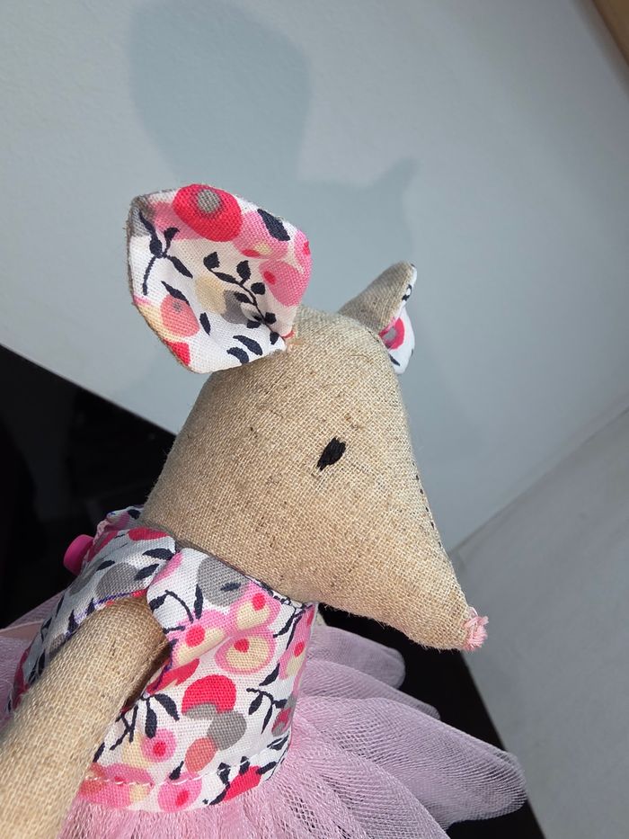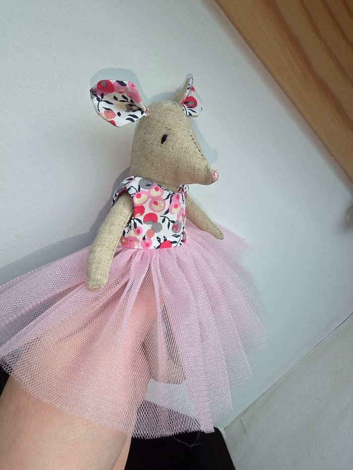 Souris en tissu fait main Assortie de sa robe rose à fleurs et à tulle. Très jolie , la robe s'enlève pour pouvoir habiller la souris d'une autre manière. Possibilité de confectionner d'autres robes 👗
