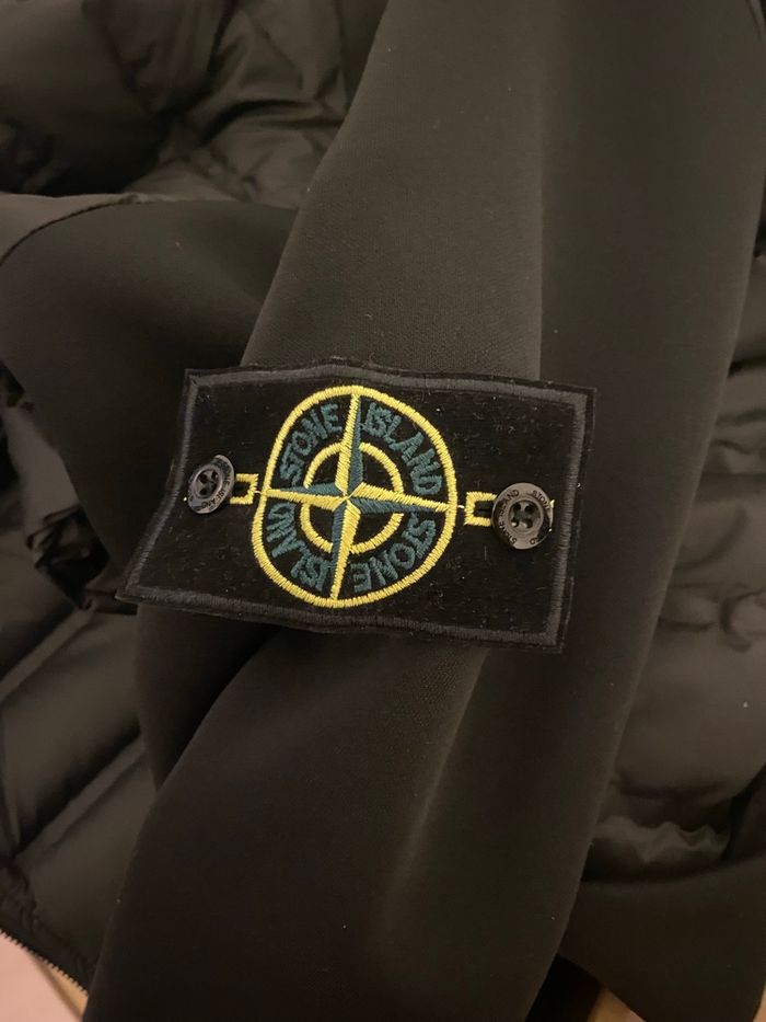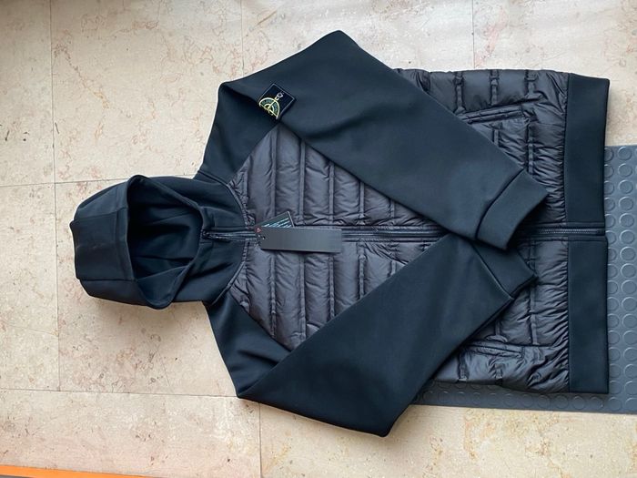 Veste stone Islande noire zippée avec capuche, modèle hybride très recherché. ✔️ Panneau avant matelassé pour la chaleur ✔️ Manches et capuche en matière technique stretch (confort + liberté de mouvement) ✔️ Badge Stone Island iconique sur la manche ✔️ Coupe moderne, parfaite pour un look streetwear ou casual chic ✔️ Idéale mi-saison / hiver doux 👉 Veste en excellent état, très peu portée, aucune tache ni défaut. 👉 Produit propre, prêt à être envoyé rapidement.