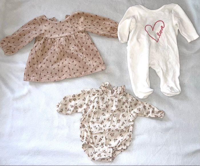 1 robe Kiabi + 1 chemisier body à pression Zara + 1 pyjama orchestra offert (neuf sans étiquette ma fille n’a pas porté de 1 mois finalement)