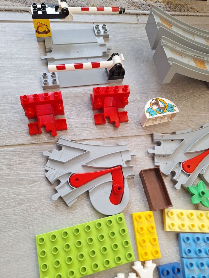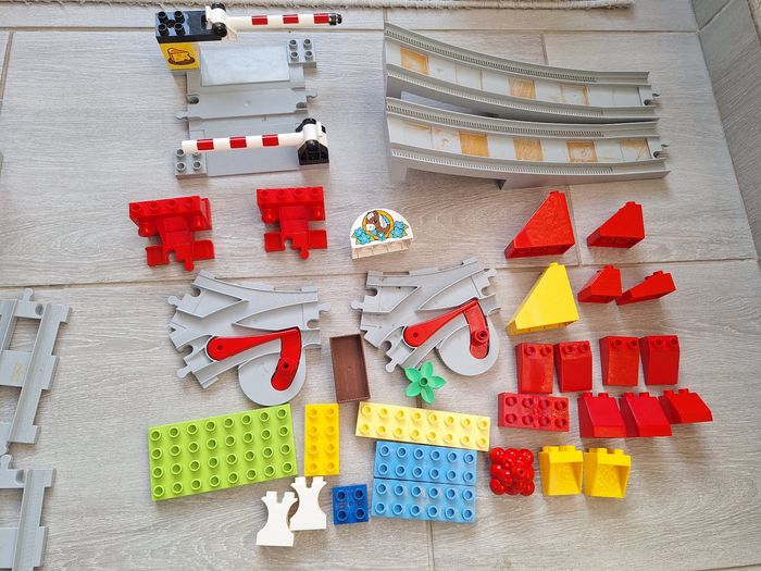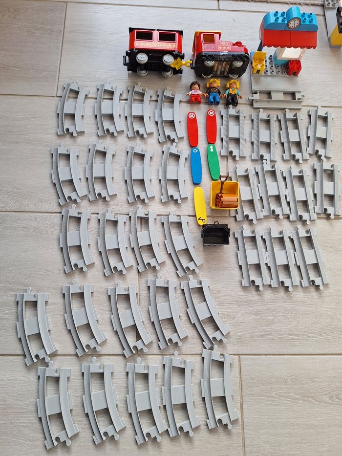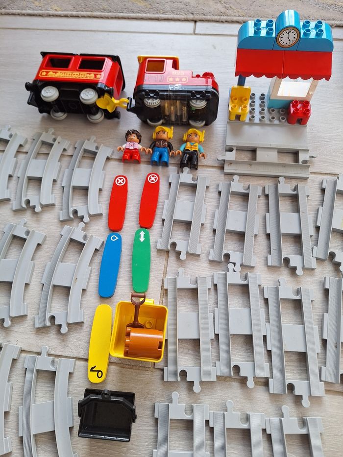 Lego duplo le train a vapeur et pack extension passage a niveau,2 aiguillages Manque le cache pile sous le train Contrôle possible en Bluetooth via l application lego duplo avec son et lumière Fonctionne parfaitement