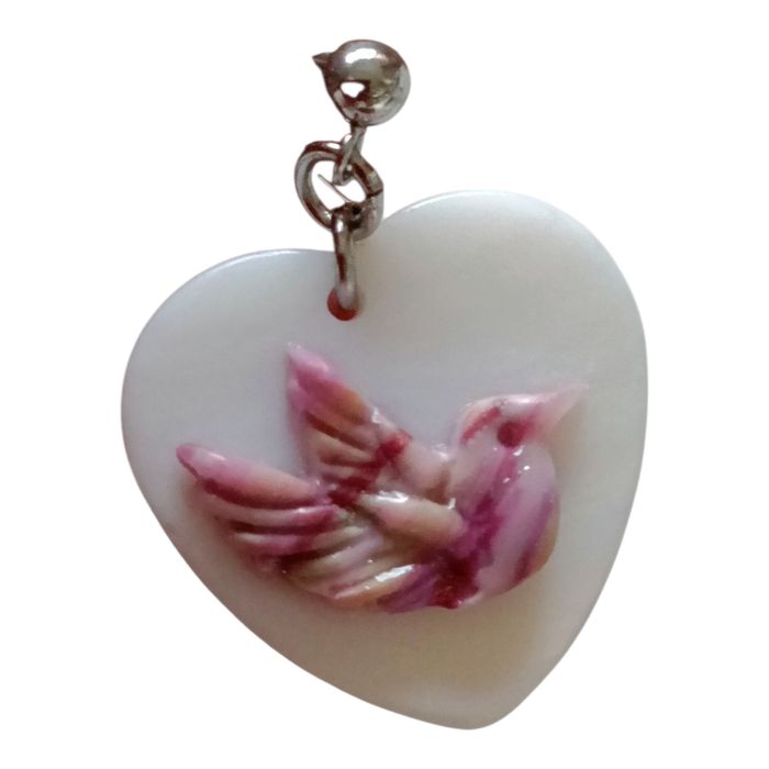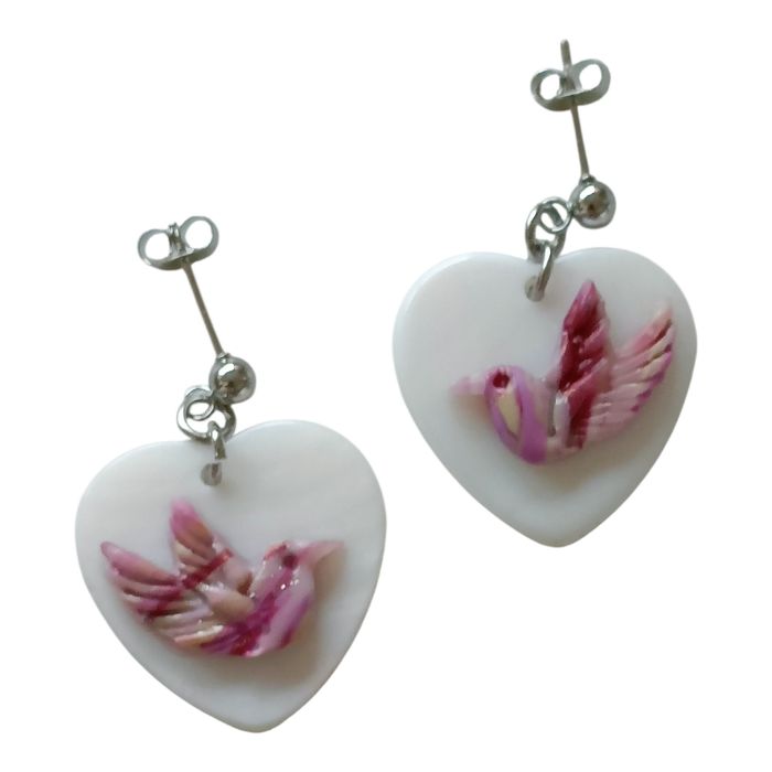 Chaque cœur est réalisé en pâte polymère d’un blanc nacré irisé, évoquant la pureté et la douceur d’une perle. Les colombes, délicatement modelées et peintes à la main dans des nuances tendres de rose poudré, mauve et corail, semblent s’envoler en harmonie, symbolisant l’amour éternel, la paix et la complicité d’un couple. Les ailes légèrement texturées captent la lumière pour un effet vivant et lumineux Support : cœur nacré  Colombes pâte polymère  Couleurs dégradé de rose Attaches : tige acier inoxydable couleur argent  Vernis résine UV  Boucles d'oreilles Ni repris, Ni échangé.. pour raison d'hygiène  Pas laisser à la portée des enfants