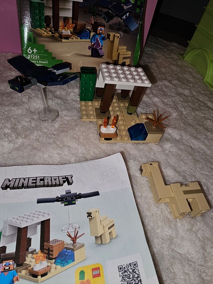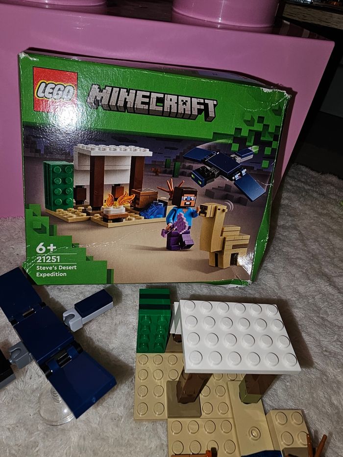 🎮 LEGO Minecraft réf. 21251 – Steve’s Desert Expedition Super set Minecraft avec le décor désert, le dragon volant, le lama, et la scène complète 🧱✨ Idéal pour jouer, compléter une collection ou récupérer des pièces. 📦 Inclus (voir photos) : 🐉 Dragon volant (avec support) 🦙 Lama 🏜️ Décor désert + accessoires (feu, eau, cactus, abri, etc.) 📘 Notice incluse 📦 Boîte incluse (état correct, voir photo) ❗ À NOTER : le personnage / minifig (Steve) est manquant ➡️ Le reste est conforme et en très bon état. 📸 Les photos font partie intégrante de la description. 🧸 ÉTAT Très bon état général Pièces propres Assemblage OK Idéal aussi pour pièces détachées / compléter un set 📦 Envoi rapide et soigné