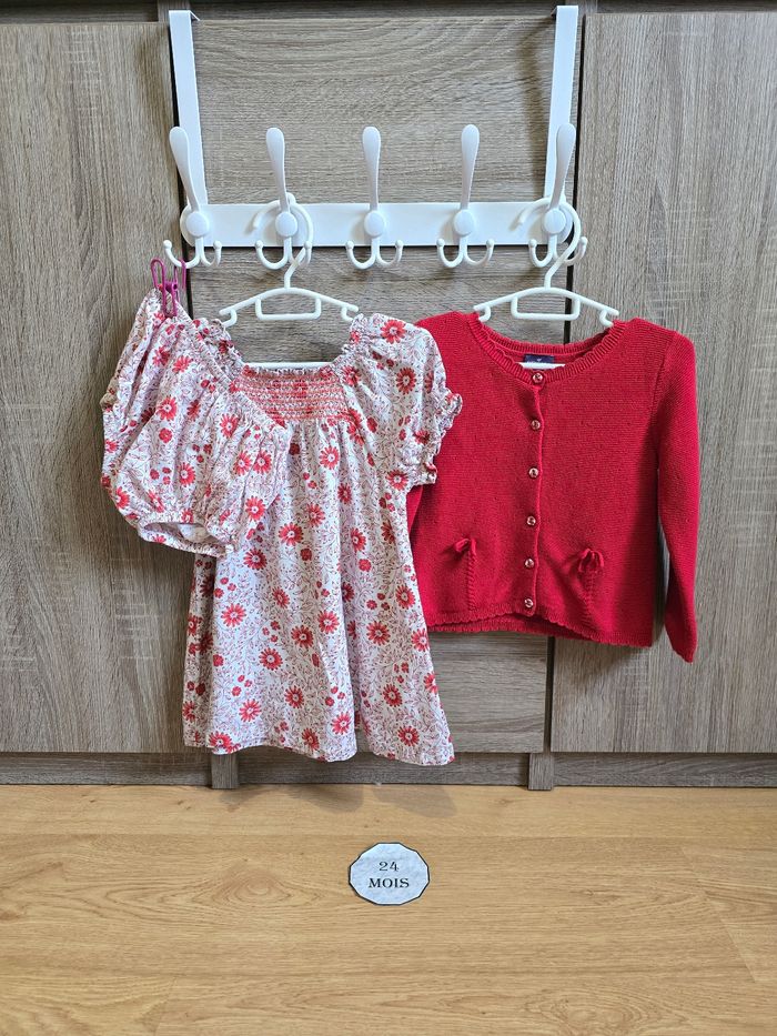 Lien direct vers les tailles équivalentes dans mon dressing : #fdhsarah24mois #fdhsarahSGMJ 📜 Lot comprenant 7 pieces : - Robe fleurie imprimé fleur rose clair et rouge sur fond ecru. Manches courtes ballons et smocks sur buste. Accompagnée de son bloomer. Ref : MALAURENE - Cardigan / Gilet rouge avec noeuds brodées. Ref : MALILI - Blouse avec smock sur buste et fleurs brodées rouge et rose pâle. Ref : MALUCILE - Legging imprimé fleuri écru et rouge avec sa coupe flare et ses volants sur la taille. Ref : MALENNA - Combinaison imprimée fleurie manches volantées avec finition fantaisie. Ref : MALINA - Chapeau en coton imprimé fleuri rouge sur fond ecru. Ref : MALOUANE Collection : Rouge de Garance Taille 📏 : 24 mois 86 cm État 🔍 : Très bon état Marque 🏷️ : Sergent Major Je suis disponible pour toutes questions ou photos supplémentaires. 📦 L’envoi se fait le plus rapidement possible Bon Shopping