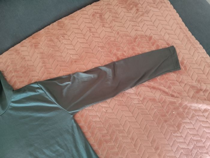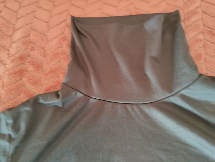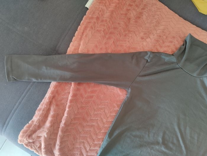- Coupe : Manches longues, col montant souple, coupe droite. - Tissu : Matière douce et extensible, probablement un mélange de coton et élasthanne ou modal. Le tombé semble fluide et confortable. - Taille estimée : Taille adulte M, à confirmer selon largeur d’épaules et longueur de manches. - Style : Polyvalent et sobre, parfait pour une tenue cocooning ou comme base sous un pull ou une veste. Peut aussi convenir à une tenue légèrement habillée selon les accessoires. T-shirt gris à col haut souple - Couleur : Gris anthracite, profond et neutre. État neuf