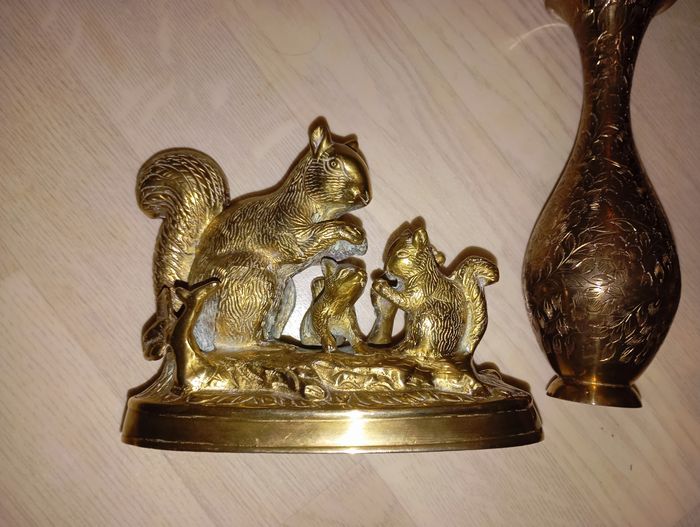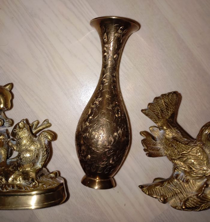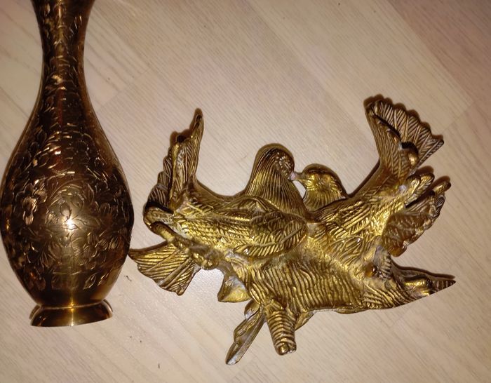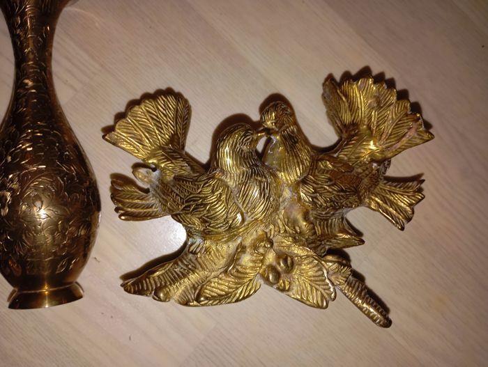 Ensemble de 3 décos en métal doré (peut-être en laiton, mais je n'y connais rien) comprenant 1 vase indien, 1 déco avec 2 colombes (ou tourterelles) et des écureuils Provient d'un héritage, à renettoyer car trace de Miroir Très lourd mais très joli Très bon état général