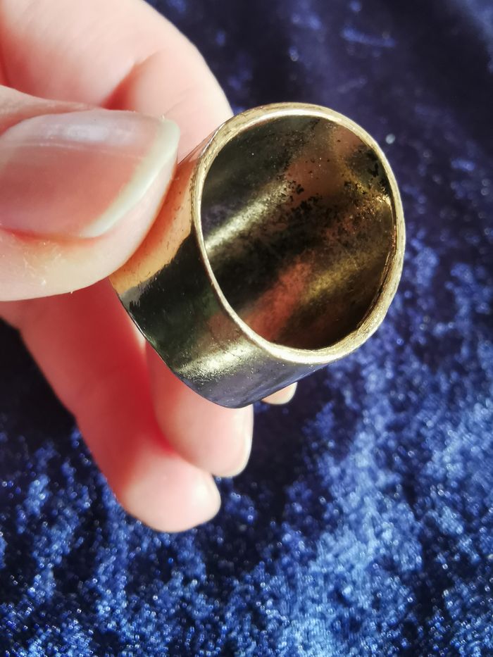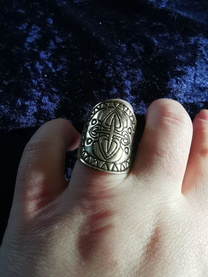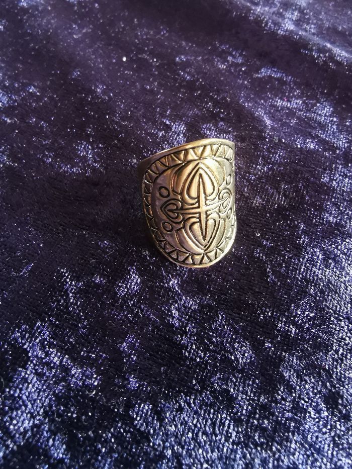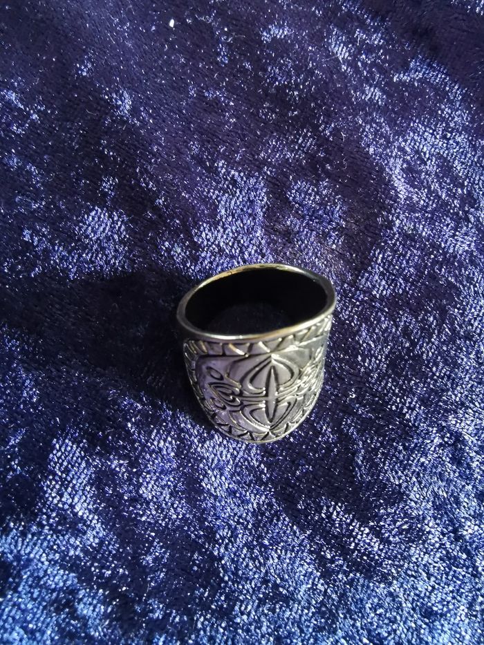 Bague argentée style médievale, en très bon état. Bague de couleur argenté, n'a pas de poinçon, mais ressemble à de l'argent, l'intérieur est légérement noircis. Belle bague originale. Dimensions : Diamètre : 19 mm Hauteur : 27 mm Taille : 53 Poids : 6g