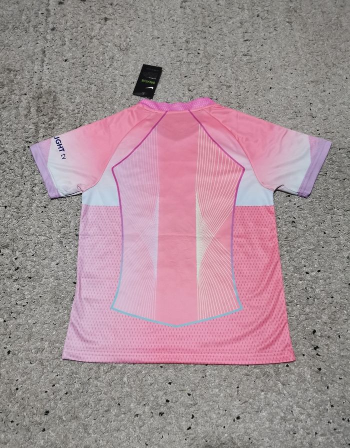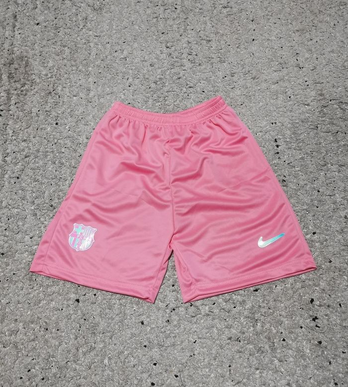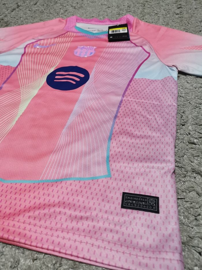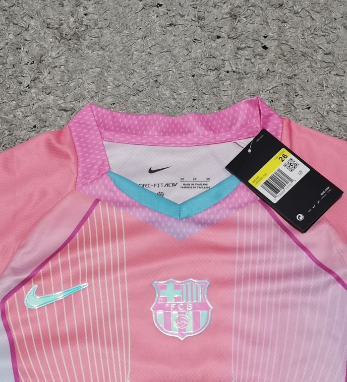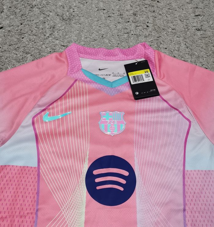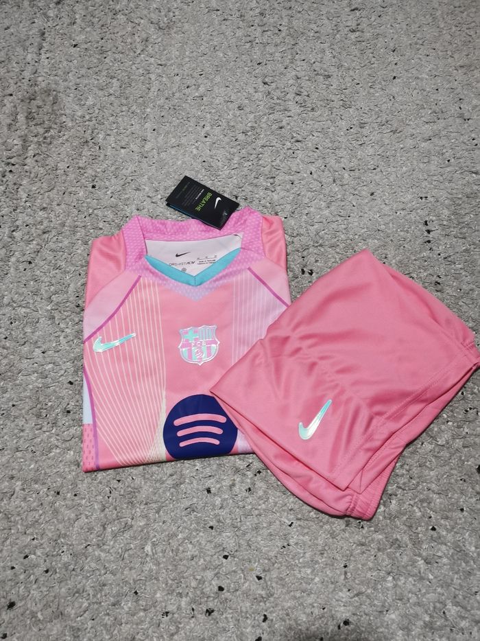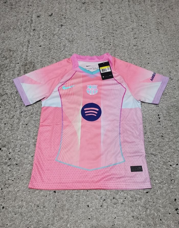 Ensemble concept FC Barcelone saison 2025 – coloris rose dégradé. 🆕 Neuf avec étiquette, jamais porté. 📏 Taille : 12 ans 💯 Maillot + short, tissu respirant et léger. Parfait pour les fans du Barça ou pour jouer au foot avec style. ⚽ Logo Nike, sponsor Spotify, écusson brodé. Envoi rapide 📦