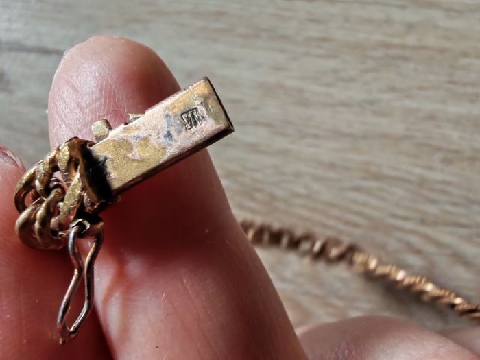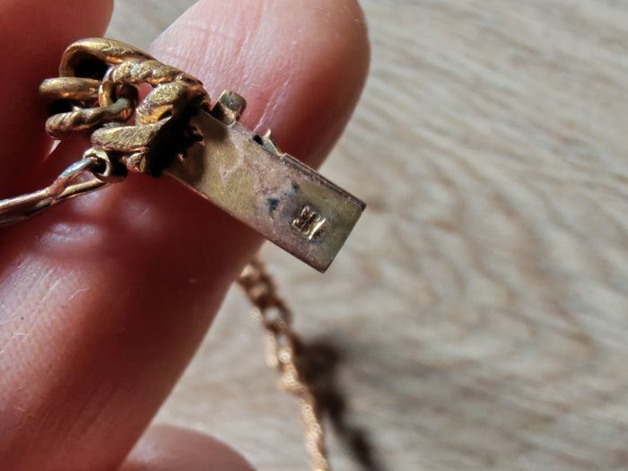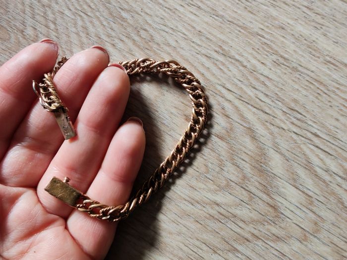 Bracelet gourmette chaîne maillons cubains vintage, probablement plaqué or, car a une sorte de poinçon (incomprehensible), le bracele est en bon état général, le fermoir est un peu dur. Dimensions : Longueur : 19 cm Largeur : 5 mm Poids : 14g