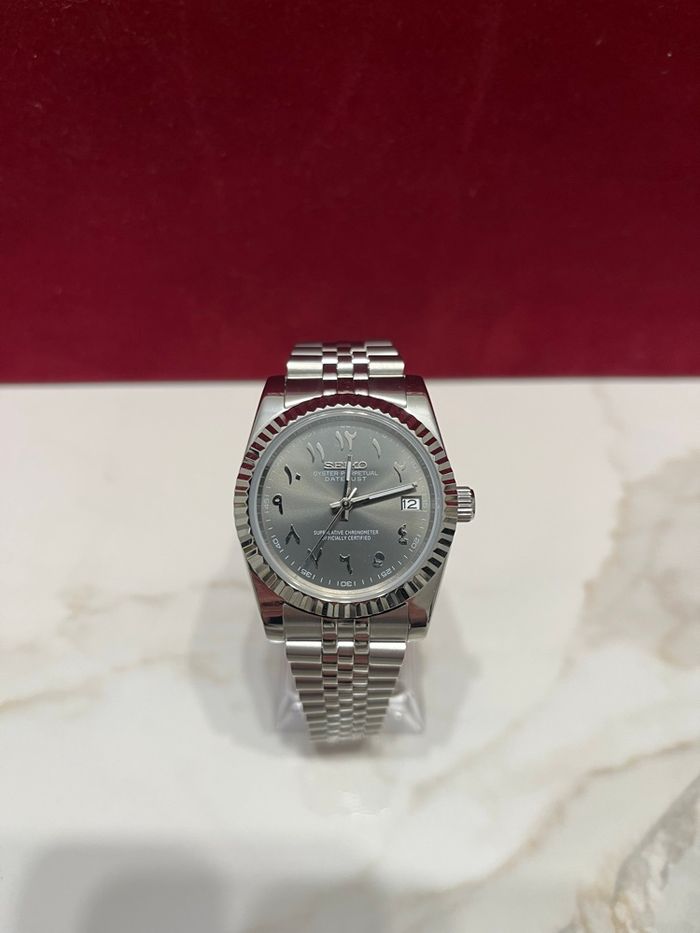 Montre seiko mod cadran arabic dial gris (plus de photo de la couleur du cadran sur demande) -mouvement automatique nh35 -boîtier acier inoxydable étanche (3 ATM) -verre saphir -bracelet jubilé -41h réserve de marche N’hésitez pas si vous avez la moindre question ⚠️ cette montre est assemblée/modifiée avec des composants compatible Seiko mais n’est en aucun cas rattachée à l’image de la marque ⚠️