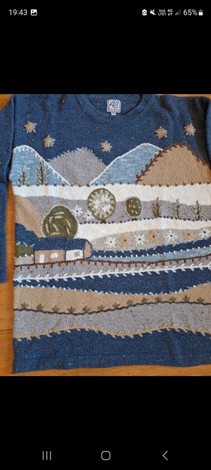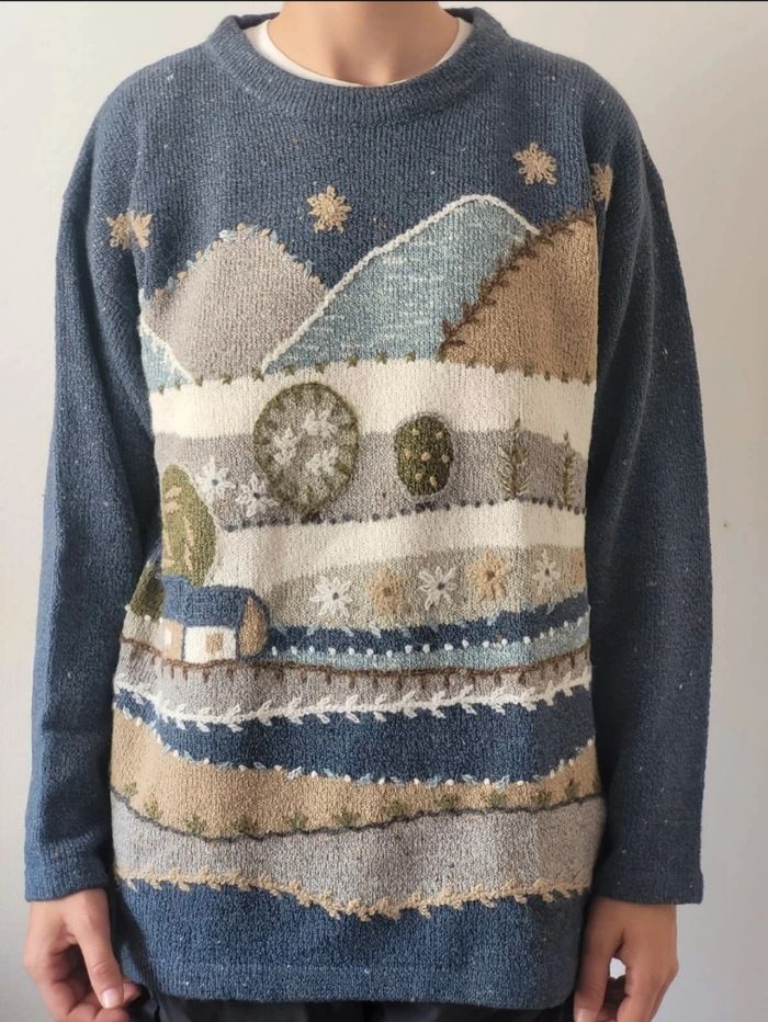Pull maille jumper knit vintage à motifs (dessin de montagne et maison) couleurs pâles 🔥 Taille L 👕 Mesures en photo 📏 15 % laine 85 % acrylique Je suis dispo par message pour plus d'infos ! Tags : #streetwear #vintage #rétro #chaud #warm #automne #autumn #spécial #kitsch #original #winter #hiver #pull #pull-over #knit #knitted #jumper #sweat #motif #montagne #Mountain #whool #wool #laine #acrylique acrylic #bleu #crème #blue #cosy #season #grandpa