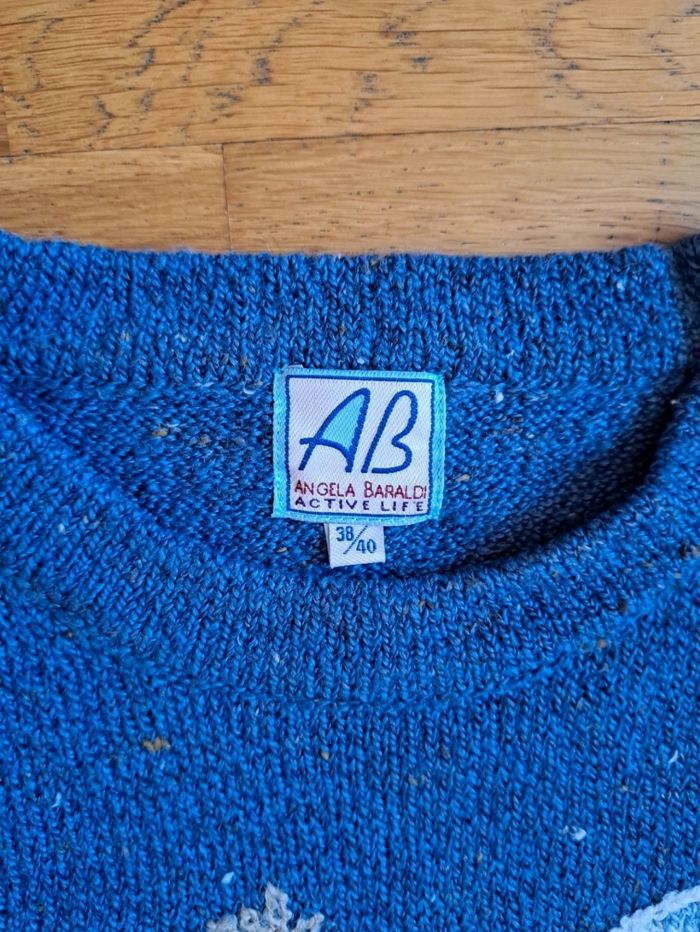 Pull d'hiver jumper maille knit bleu blanc à motifs en acrylique et laine vintage 80s/90s - photo numéro 7