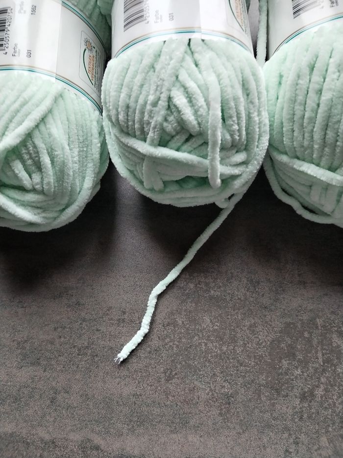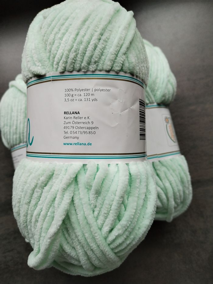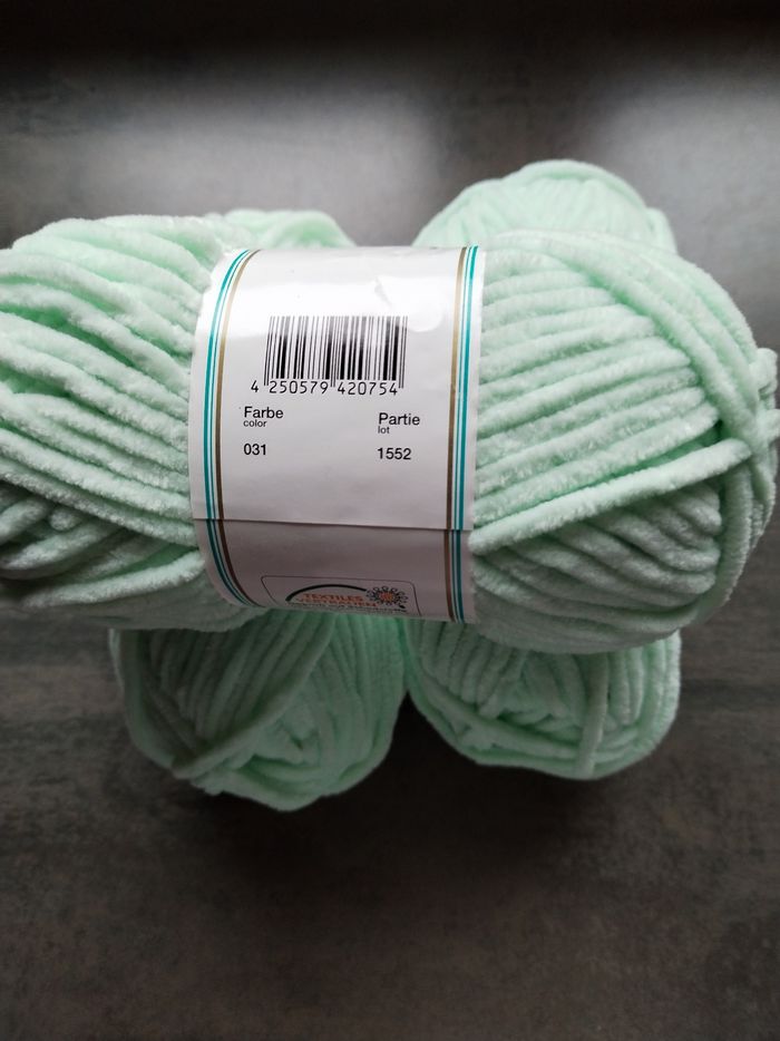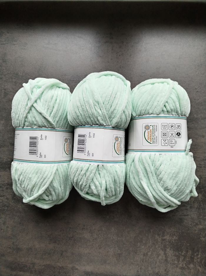 Lot de 3 pelotes de Laine (300 g) chenille-velours d'un superbe coloris vert menthe (pastels). Parfait pour la confection d'amigurumis, de couvertures douillettes ou d'accessoires doudous Composition : 100 g env 120 m, 100 % polyester ​Couleur : Vert Menthe (Couleur 031) ​Bain (Partie) : 1552 (les 3 pelotes sont du même bain pour un rendu uniforme) ​Taille de crochet/aiguilles conseillée : 6 mm ​Échantillon : 10 x 10 cm = 9 mailles / 16 rangs ​Entretien : Lavable en machine à 40°C ​Certification : Certifié Oeko-Tex (Textiles de confiance) ​État : Neuf, jamais utilisé. Les étiquettes sont intactes N'hésitez pas à regarder mes autres annonces pour regrouper les achats et économiser sur les frais de port 👍 Plusieurs pelotes et d'autres couleurs disponibles 👍 🧶 📦Envoi rapide et soigné ​