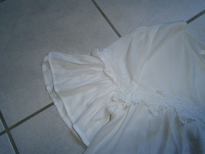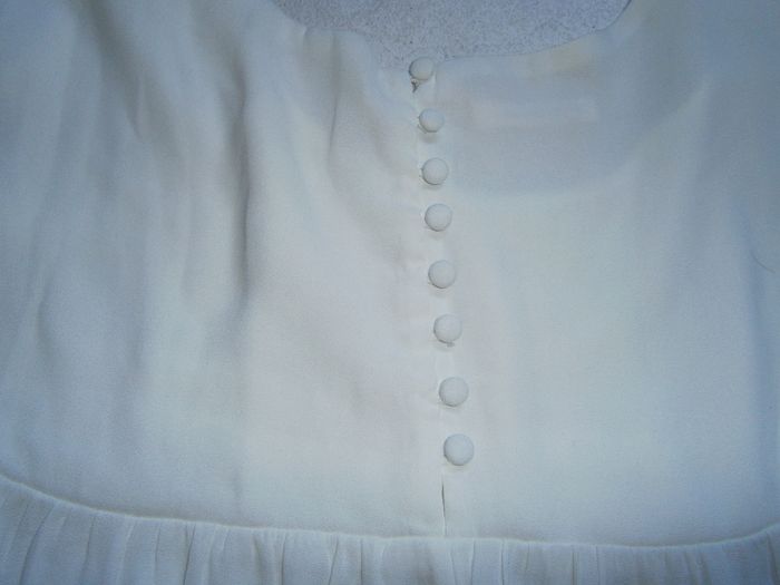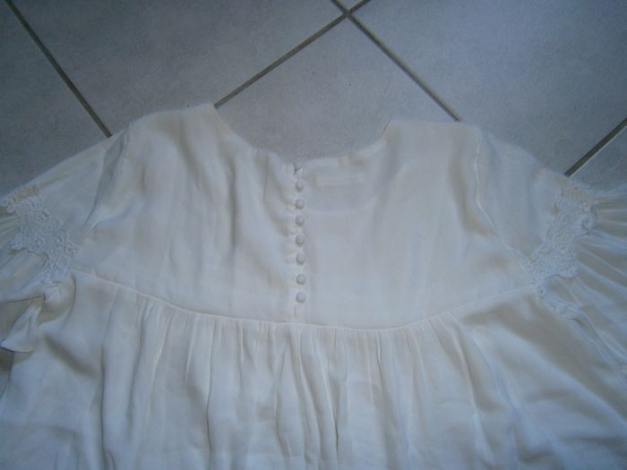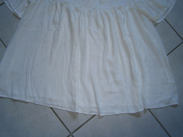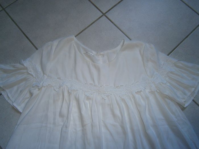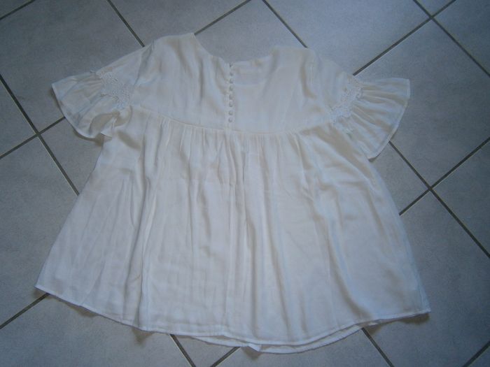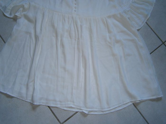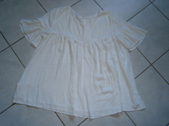 Chemisier à manche courte. Style Vintage. Marque PROMOD. Couleur blanc. Col rond. Doublé. 100% polyester. Dentelle devant et sur les manches. Attache par boutons dans le dos. Un petit trou sur le bas noyé dans les plis (photo). Taille 44.