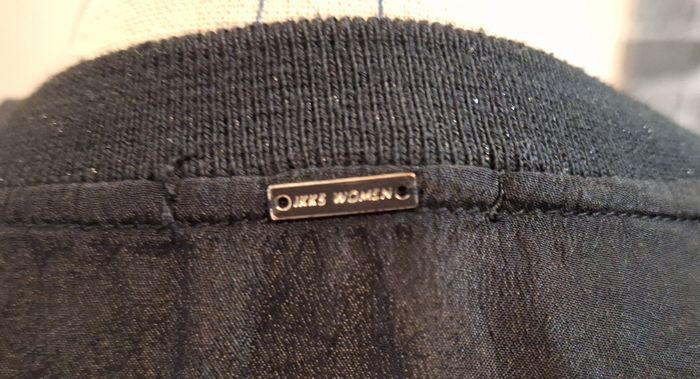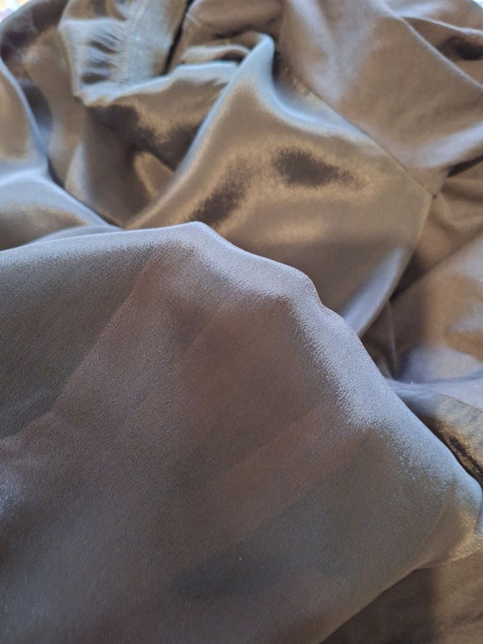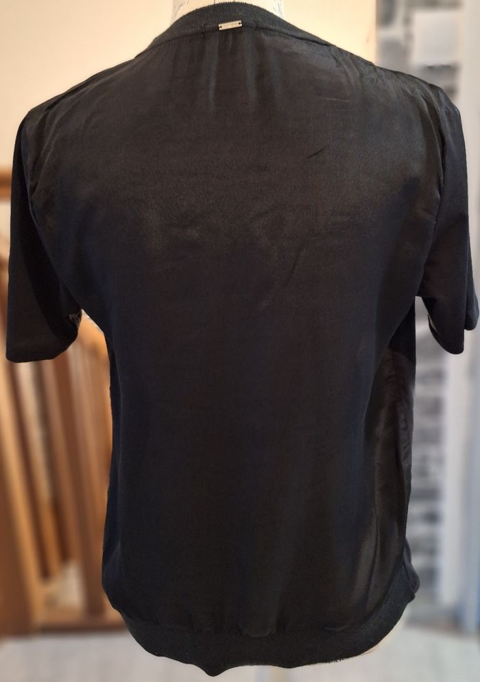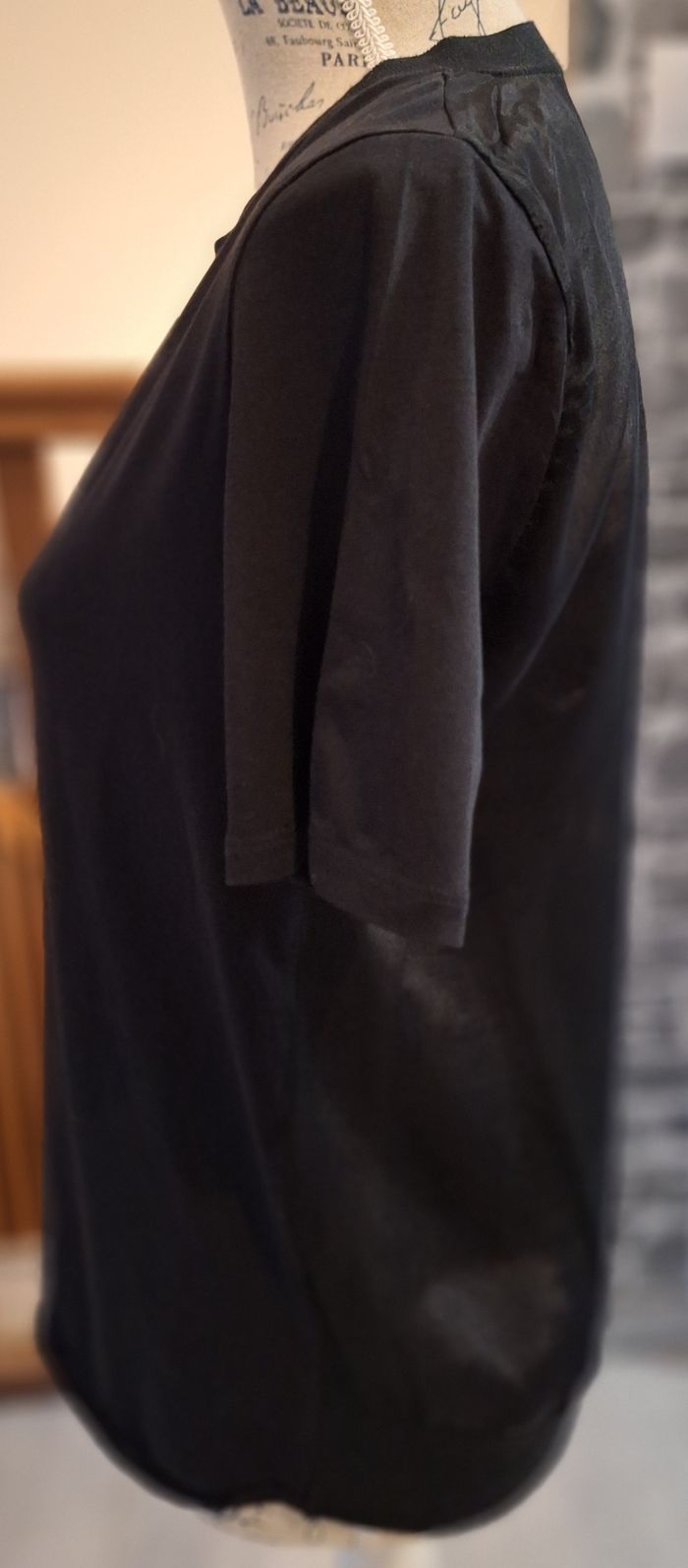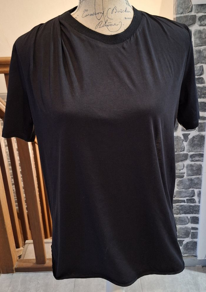 Tee-shirt noir uni. Le devant est en 100 % coton avec une sorte de faux pli sur l'épaule droite qui fait un effet drapé. Le col et la base derrière sont en matière légèrement extensible brillante. Le dos est en voile transparent en viscose et soie. Petite plaque métallique de la marque à la nuque.