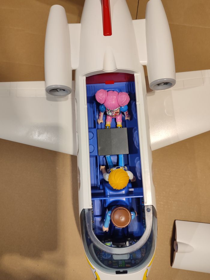 6081 Playmobil summer fun avion complet avec trains d'atterrissage et roues. 3 figurines dont le pilote de l'avion, et deux personnages substitués dont la star Rosalee issue du set 70742.