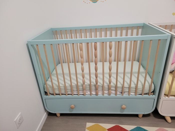 Bonjour Je vends un lit bébé évolutif 120x60 cm de la marque IKEA, modèle MYLLRA, coloris vert (prix neuf : 399 €). Le lit est en très bon état, solide et fonctionnel. À noter simplement un petit défaut esthétique : un endroit où la peinture est légèrement enlevée (visible sur photo). Il est équipé d’un grand tiroir de rangement, très pratique et spacieux. La deuxième barrière est neuve, jamais utilisée. Le lit est vendu avec un matelas KADOLIS COCOLATEX, déhoussable, en très bon état (prix neuf : 152 €). 👉 Prix pour l’ensemble (lit + matelas) : 190 € En option, je vends également une housse de matelas intégrale anti-acariens TEXAAL (Protescom), de qualité médicale, achetée récemment (septembre 2025) au prix de 35 € (prix neuf : 59 €). 📍 À venir chercher et démonter sur place.