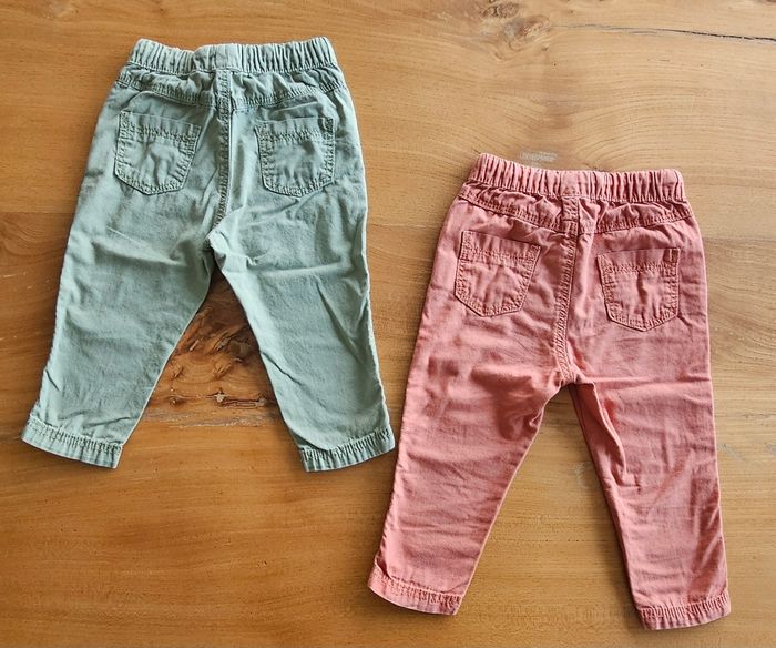 Lot de 2 pantalons bébé garçon : • 1 vert • 1 rouge Élastique à la taille. Poches sur le devant et à l'arrière. Porté mais reste en très bon état. Aucune tâche, ni trou 👌