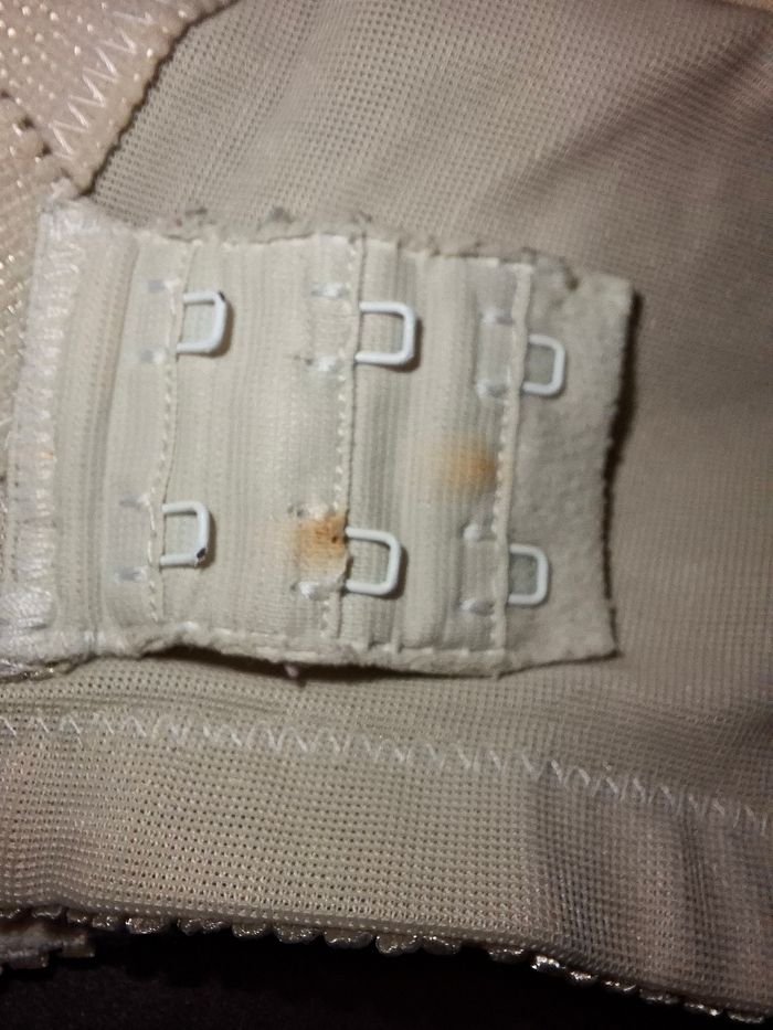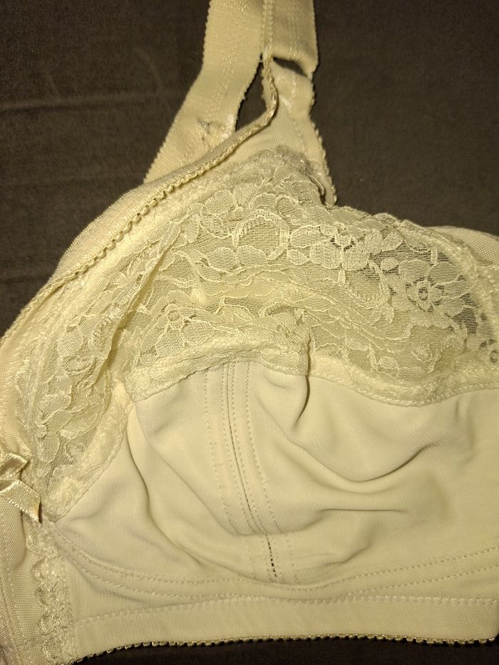 Vends un soutien-gorge blanc classique alliant confort et féminité. ​Taille : 100C (indiqué 100/44 sur l'étiquette). ​Design : Bonnets couvrants avec une partie supérieure en dentelle fleurie délicate. ​Détails : Petit nœud satiné à l'entre-sein. ​Maintien : Larges bretelles confortables et fermeture dos par 3 rangées de crochets. ​État : État d'usage. À noter de légères traces d'oxydation ou de décoloration au niveau des agrafes au dos, ce qui n'altère en rien le confort (voir dernière photo).