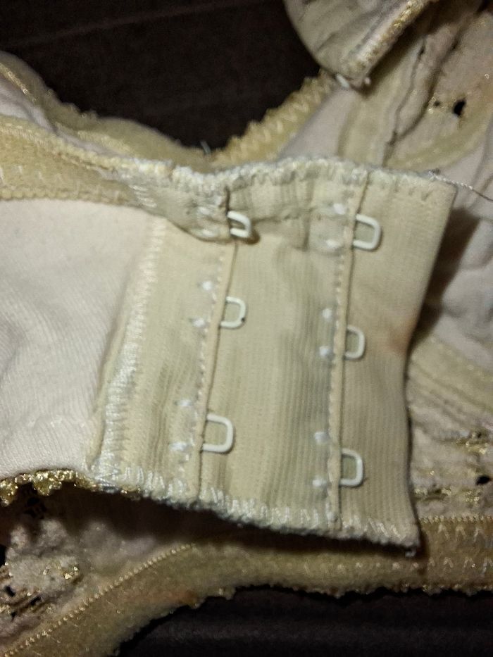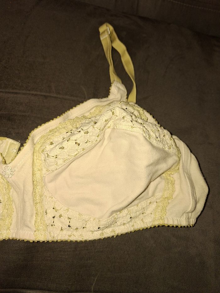 Je vends ce soutien-gorge sans armatures, alliant confort et élégance. Il est idéal pour un maintien quotidien tout en douceur. ​Taille : 105C (étiquette visible sur photo) ​Couleur : Blanc crème / Écru avec détails en dentelle fleurie ​État : Très bon état général (bien entretenu, attaches et élastiques impeccables) ​Détails : ​Fermeture par triple agrafage à l'arrière pour un meilleur maintien. ​Bretelles réglables. ​Maille douce et empiècements en dentelle délicate sur le haut des bonnets. ​Sans armatures pour un confort optimal sans compression.