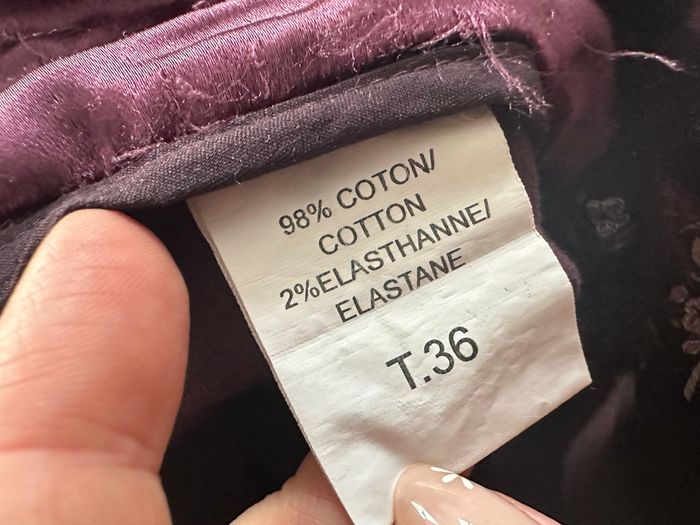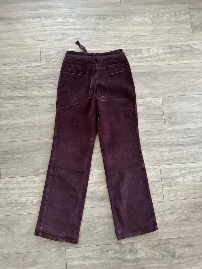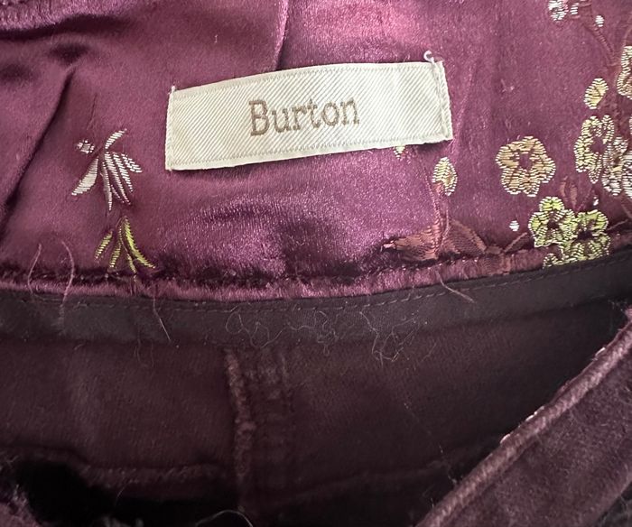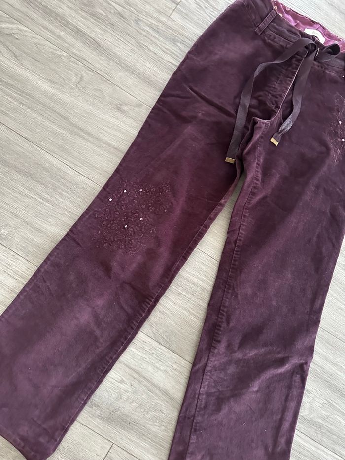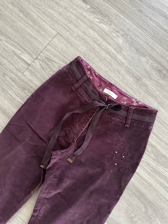 Pantalon - Excellent état - Taille 36 équivalent S Dimensions en bas de l’annonce - Marque Burton - Violet - En velours avec des paillettes brodées - Ceinture à la taille - Coton et élastane - Coupe droite Dimensions: - 36cm à la taille - 80cm entre jambe - 104cm de long