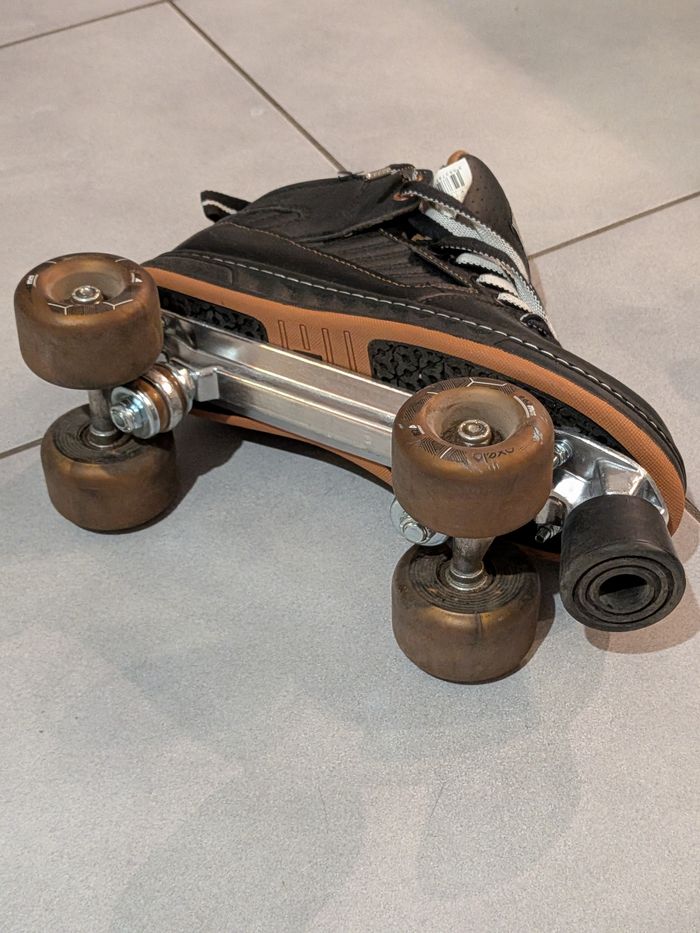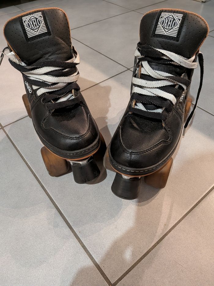 Une belle paire de roller quad (4 roues l'une a côté de l'autre) dans les roulements a billes de plombs des roues , les axes sont bien graissé, entretien des roulements, matière des chaussures en cuir véritable , paire de lacets large et neuf , les roues sont en gomme , référence des roues sont "82A" et taille des roues sont de "62mm" .un patin en gomme devant la chaussure sous les doigts de pied qui sert de départ comme de freins quand on patine en arrière. Semelle a l'intérieur neuve oxelo , matière intérieure en coton chaud , taille du pied "42" , les rollers peuvent supporter un poids maximum jusqu'à 100 kg . Le cuir a été entretenu avec un cirage épais pour nourrir le dessus et obtenir la brillance. La paire de rollers a peu servie, elle n'a pas beaucoup roulée, les rollers sont neuf . C'est une paire que j'ai acheté chez Decathlon en 2024 au prix de 110 euros, aujourd'hui, je casse le prix fortement, je le fais a -63% de réduction. C'est un tarif promotionnel "ÉNORME" .