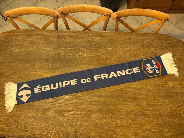 Écharpe supporter football ⚽️ Nation : Équipe de France ⭐️ : Ancienne version 1 étoile 🏷️ État : Très bon état (limite neuf) 📏 Taille : 137cm de longueur / 17cm de largeur Pour plus d'informations, n'hésitez pas à me contacter
