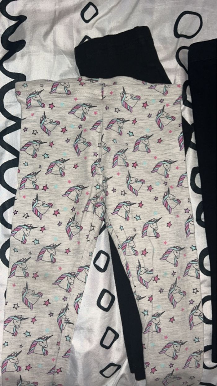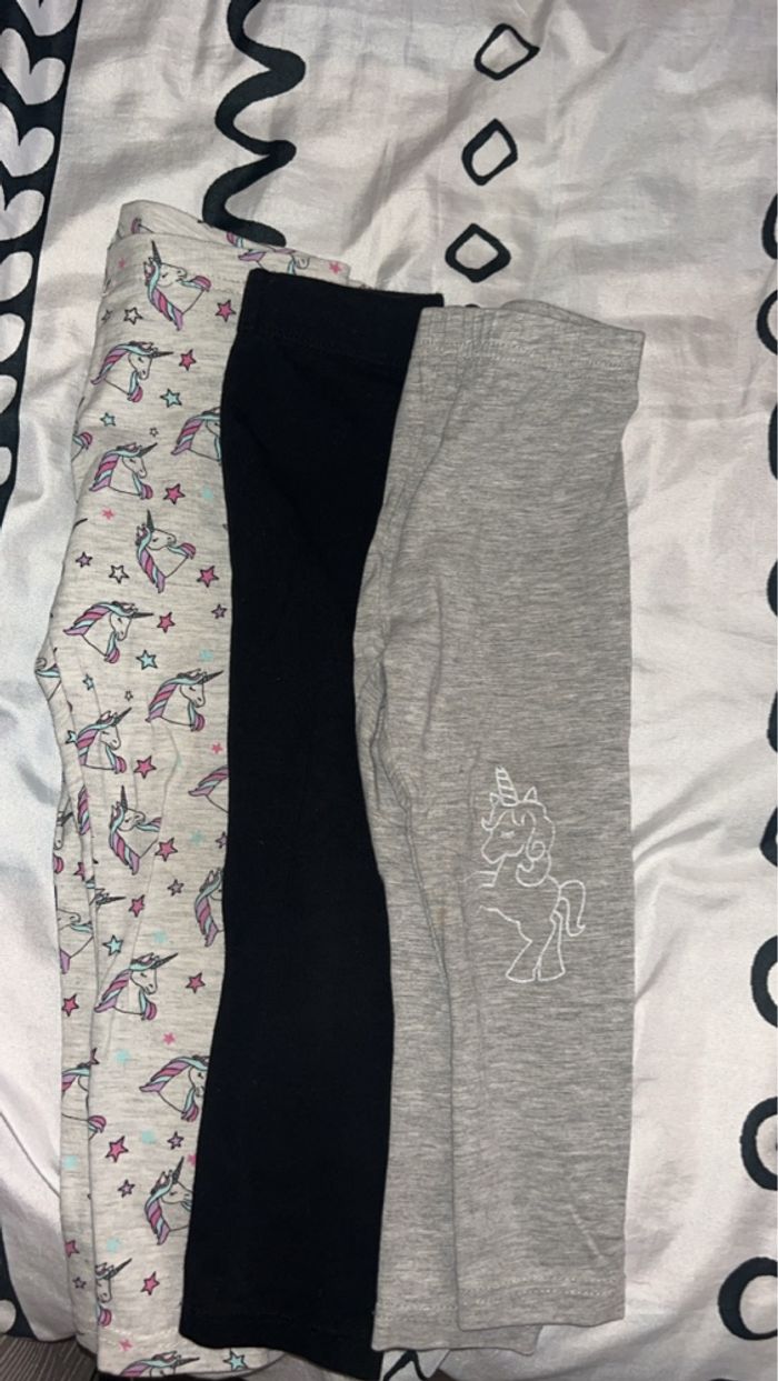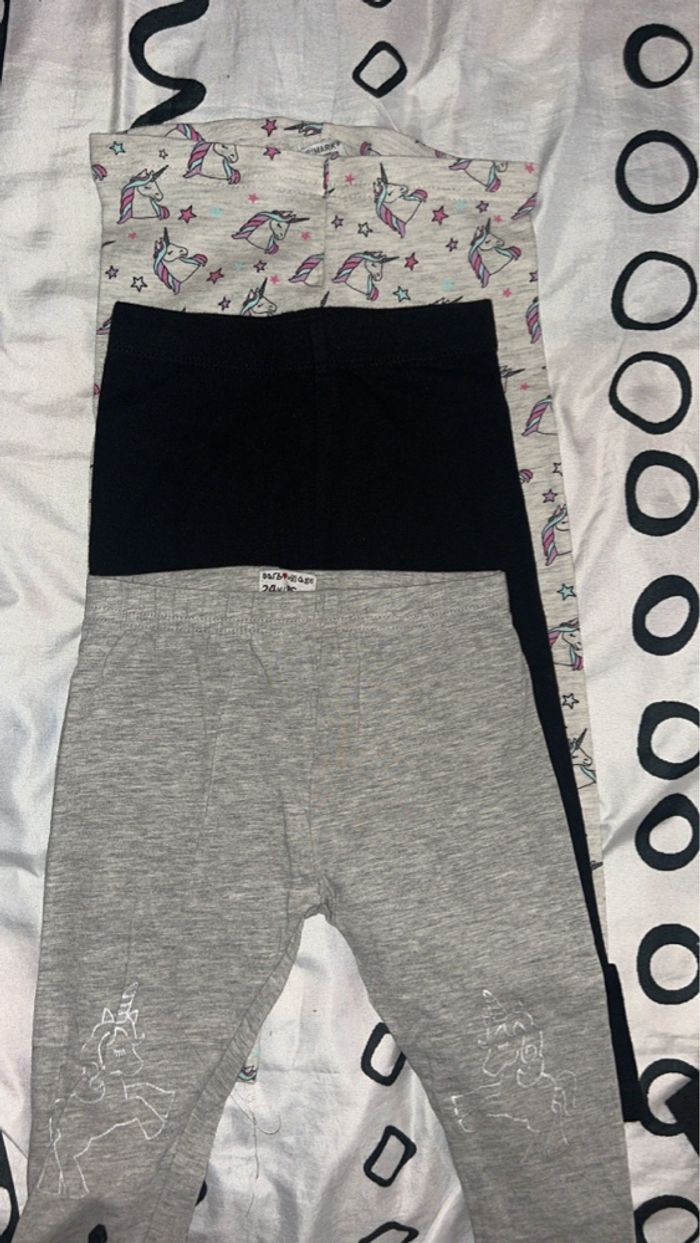 Lot de trois leggings en excellent état Le noir 24 mois(Kiabi) Le gris licorne 18/24 (primark) Le gris uni 24/36 mois (barb village )