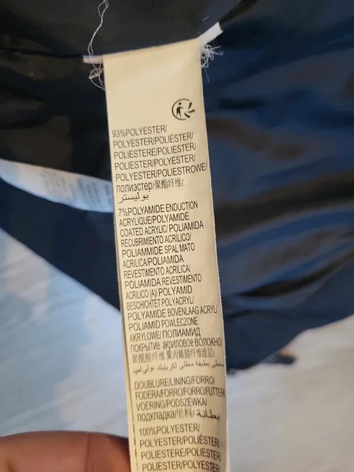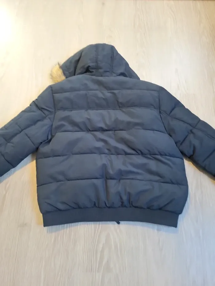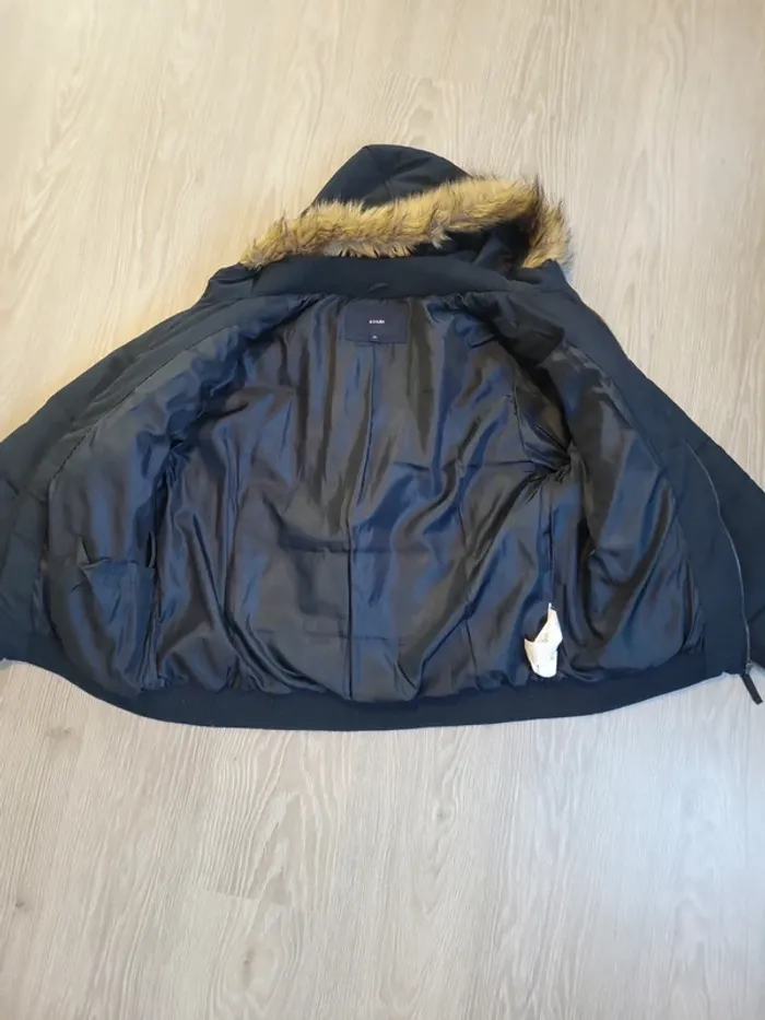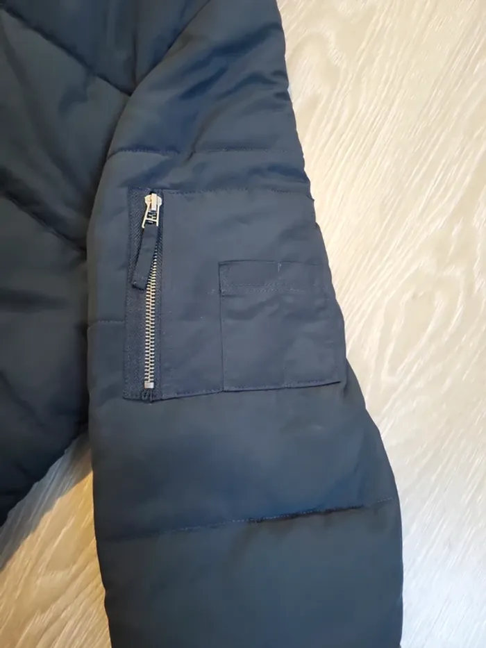 Doudoune bleu marine avec capuche et fausse fourrure autour de la capuche 2 poches avec fermeture par bouton pression Une poche poitrine avec fermeture éclair Une petite poche sur le bras gauche avec fermeture éclair Une poche interdire avec scratch et une poche intérieur avec bouton pression Très bon état, confortable et chaude La capuche ne se détache pas