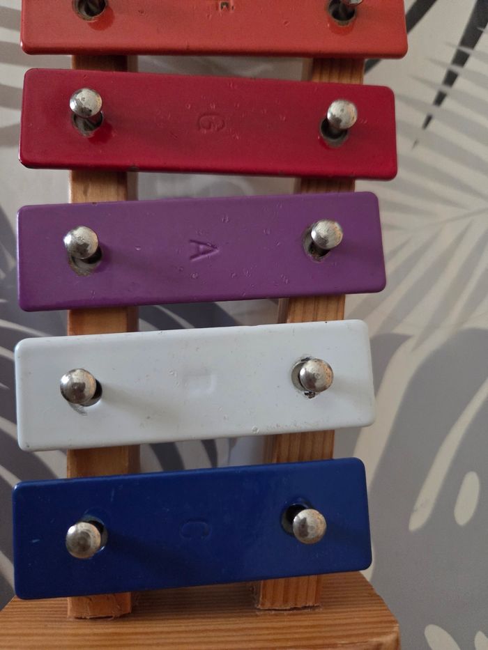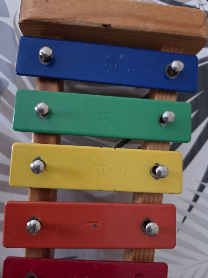 Bonjour Je vends ce xylophone en bois Avec ses 2 baguettes Des traces d'usures dessus et dessous,manque peinture (voir photo) N'hésitez pas à faire un lot dans mon dressing Cordialement