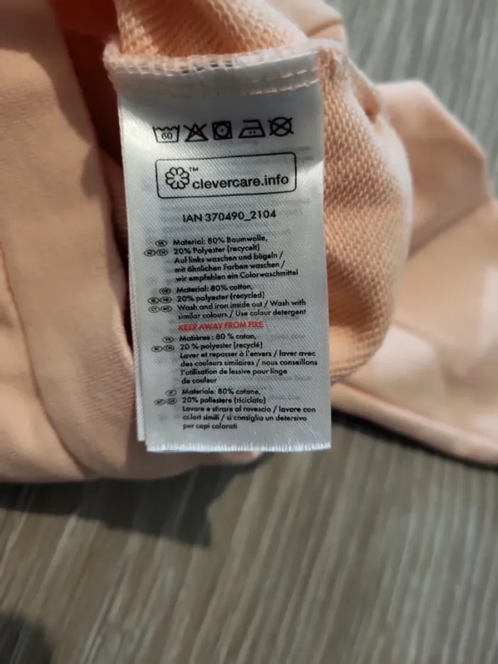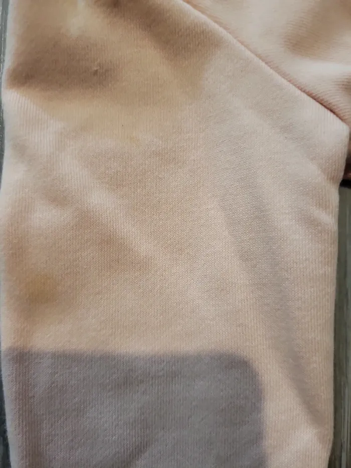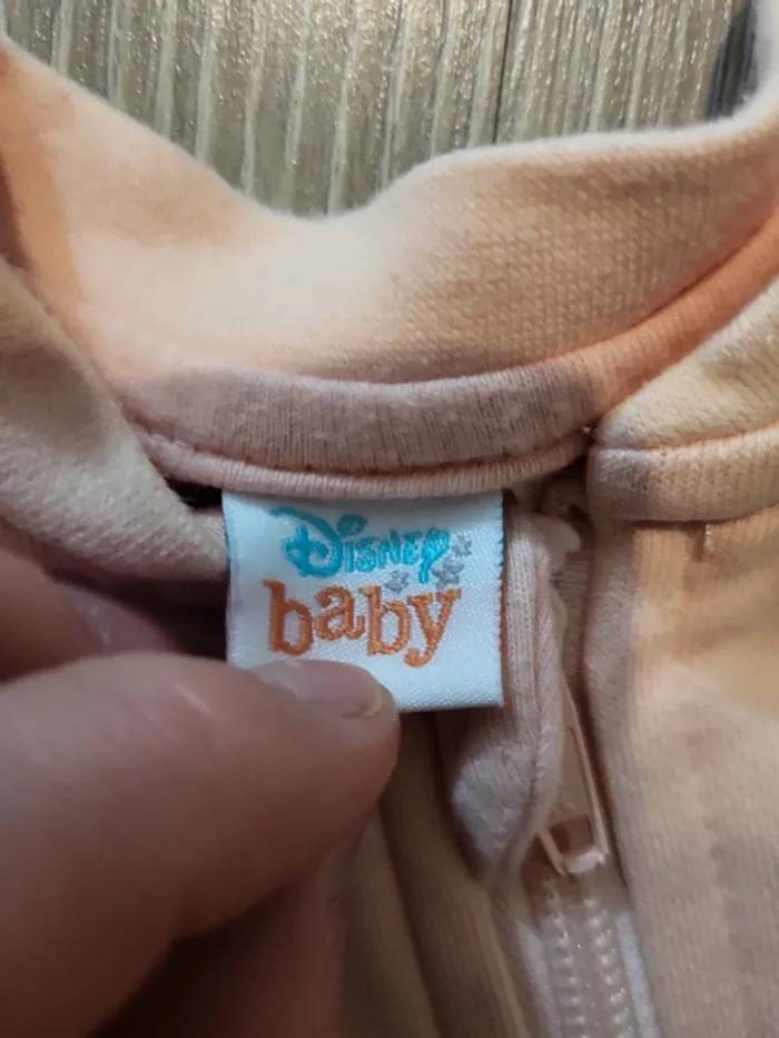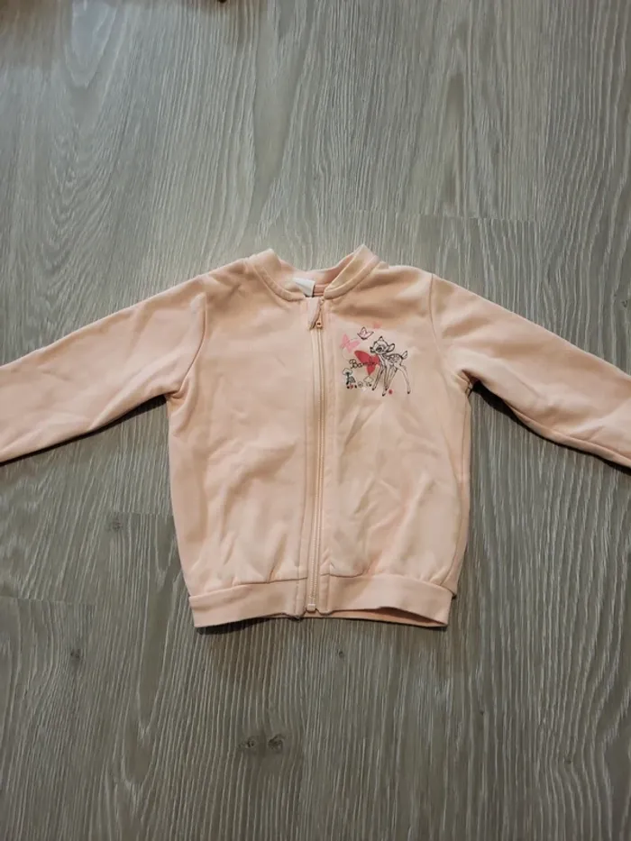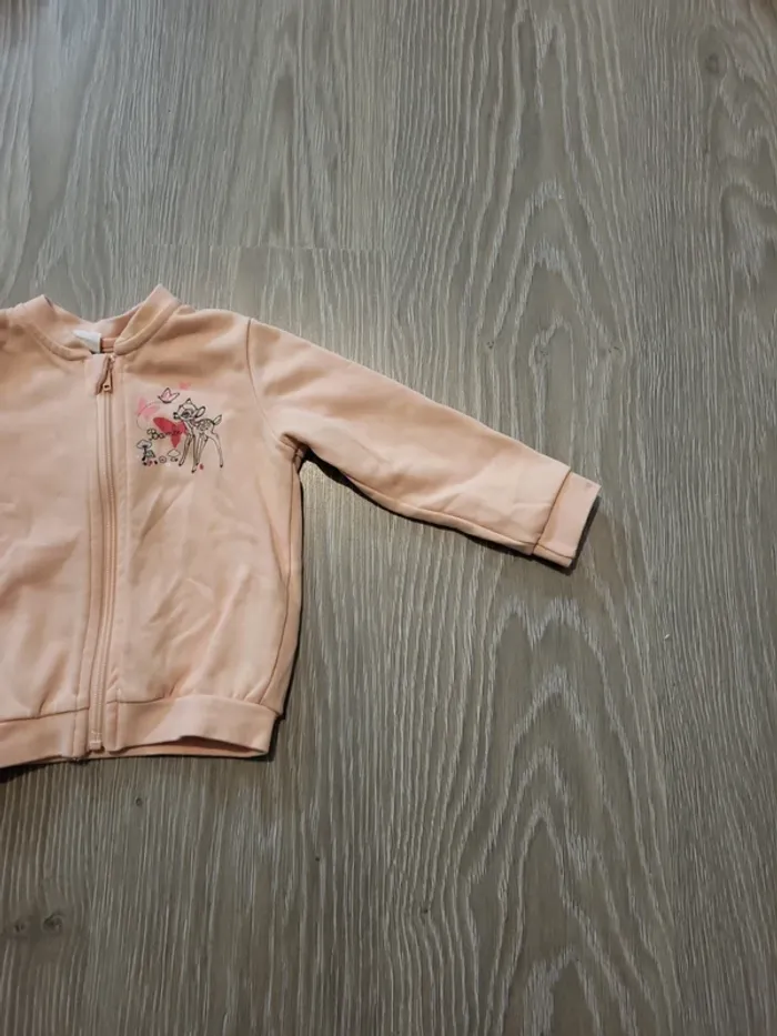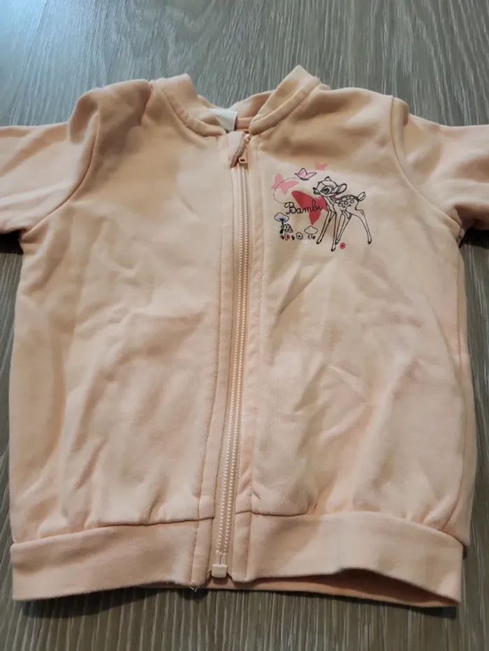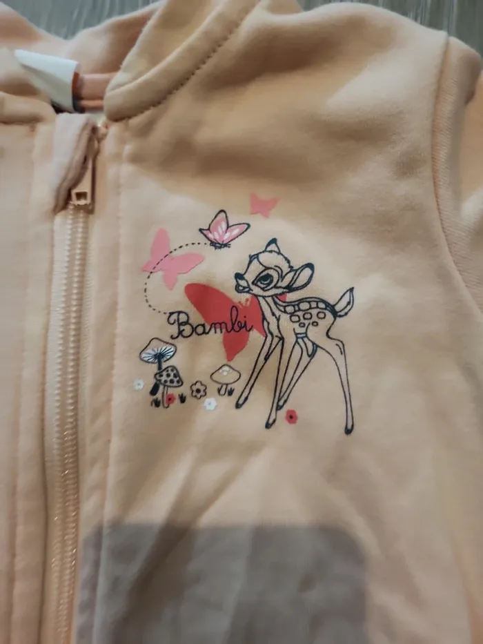 Gilet rose clair avec fermeture éclair Motif Bambi et un papillon sur la poitrine L'étiquette indique 6/12 mois, mais aussi 74/80 cm qui correspond plutôt à 12/18 mois.