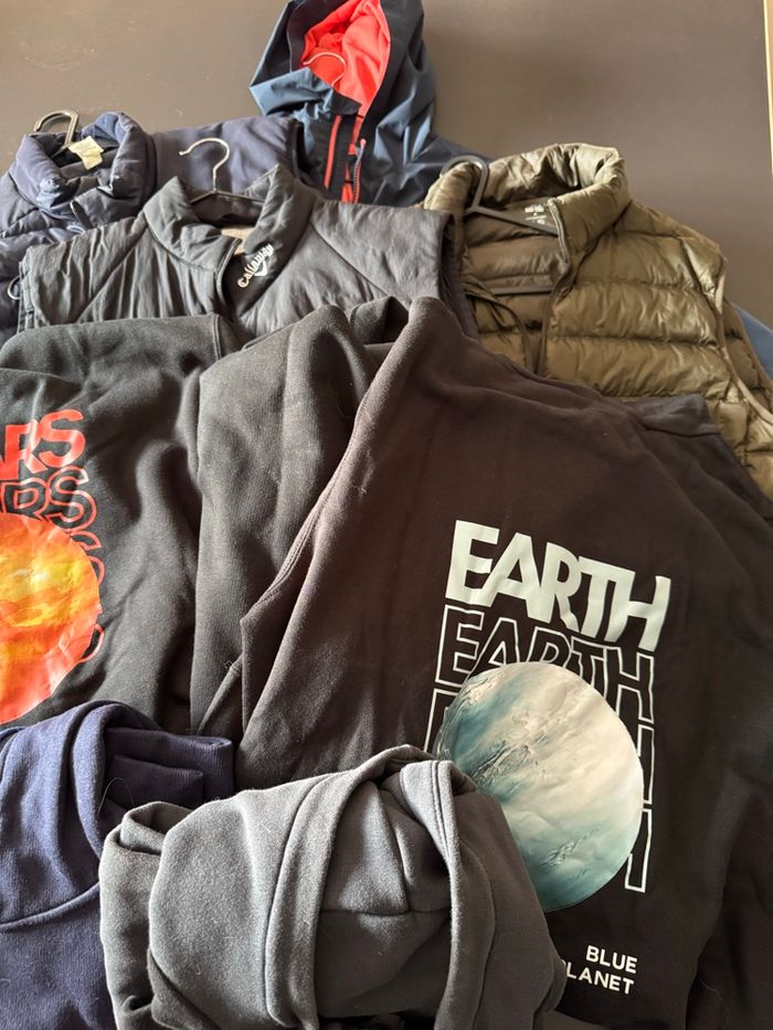 Parfait pour les revendeurs 3 Teeshirts 1 pull col rond 3 sweats 2 vestes zip 1 veste enfant Timberland 3 doudounes sans manches