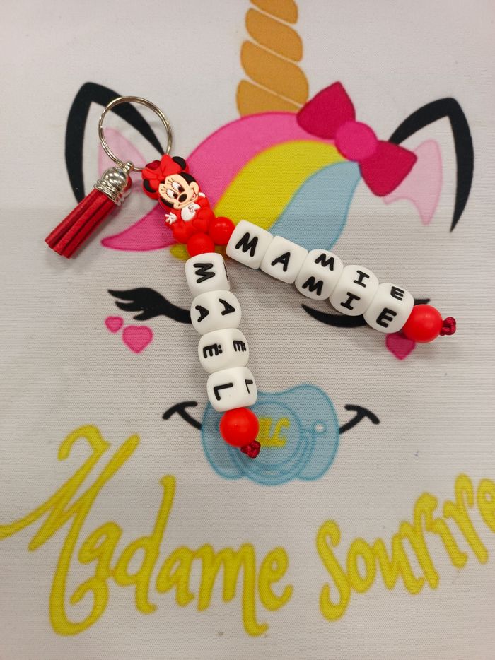 Un porte clés Minnie Baby pour accrocher vos clefs en toute sécurité, composé de perles en silicone alimentaire et/ou bois naturel. 100% personnalisable, énormément de choix de clips, perles, etc… Envoyez-moi un message afin de créer main dans la main votre accessoire idéal. Une photo du prototype de celui-ci vous est envoyé pour validation avant envoi.