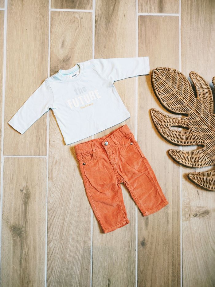 👕Vertbaudet /Baby filou - Ensemble Pantalon velours orange et t-shirt avec inscription - Taille 3mois REF02/REF11 🎀 Ensemble pep's avec un superbe pantalon orange et un t-shirt bleu clair Avec un pantalon Vertbaudet ✨Taille élastique ✨Velours côtelé orange ✨Passants pour ceinture ✨2 poches à l'avant et 2 à l'arrière Un t-shirt Baby filou ✨Encolure avec boutons pressions ✨Inscription : The futur Filou and Friends. 🔍Petit plus : rappel de la couleur orange du pantalon sur l'inscription ❇️N'hésitez pas à créer un lot pour économiser sur les frais de port❇️ Ensemble bébé, vêtement automne, couleur automne, pantalon garçon, ensemble garçon, ensemble 3 mois, Lot vêtements, vêtements bébé pas cher, pantalon côtelé