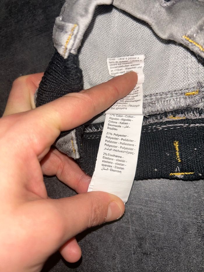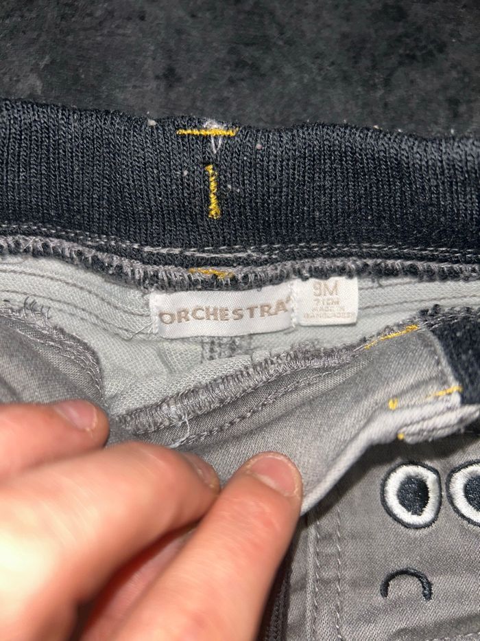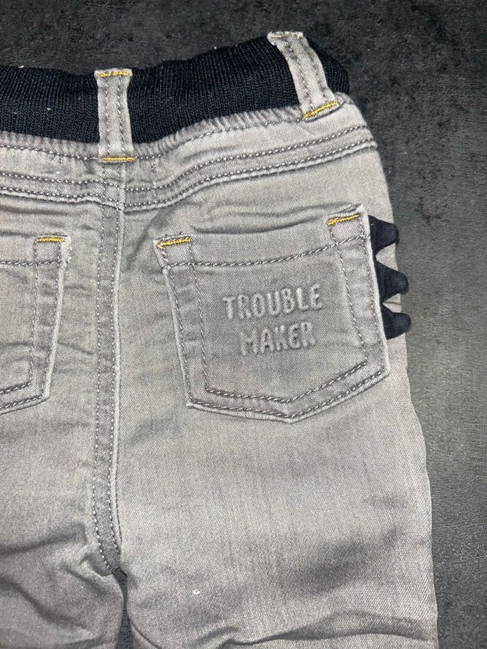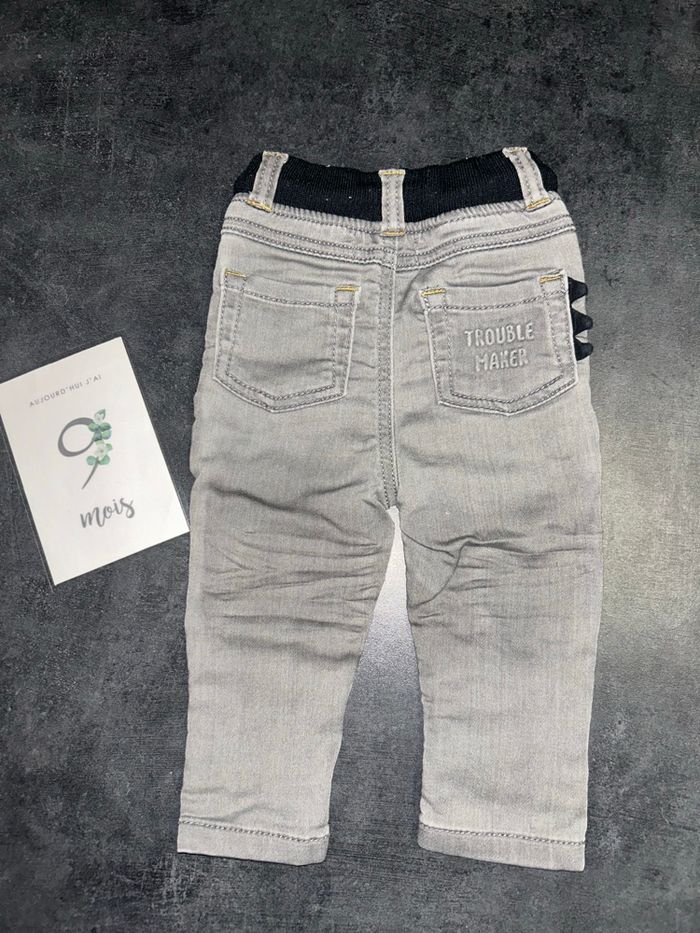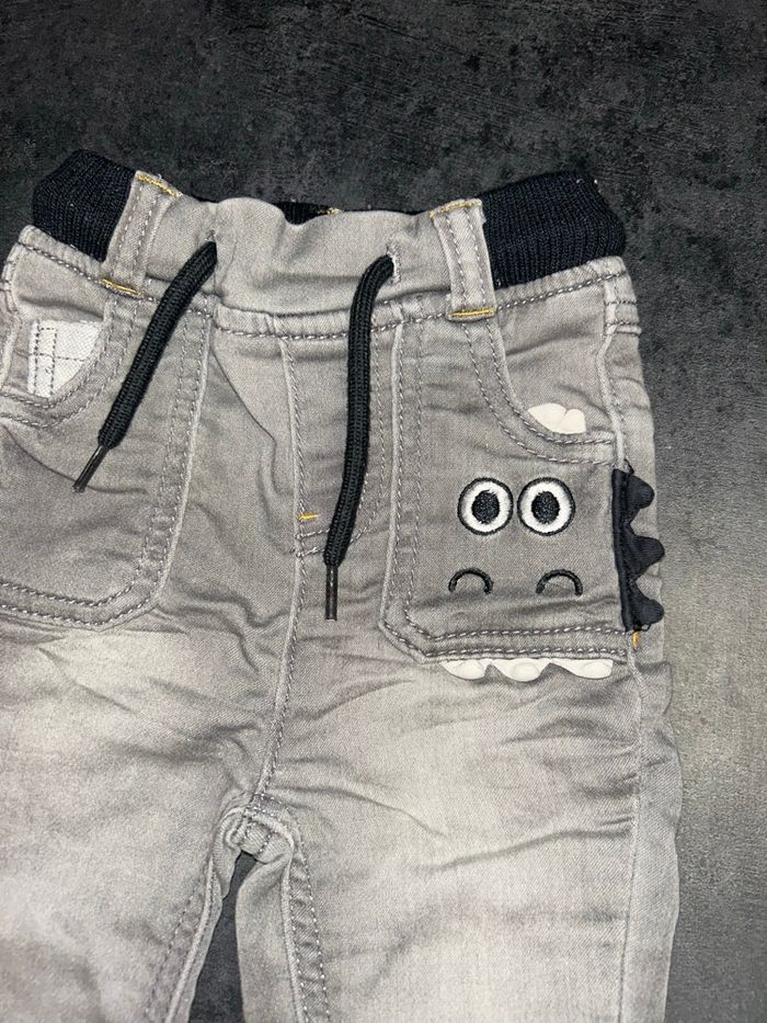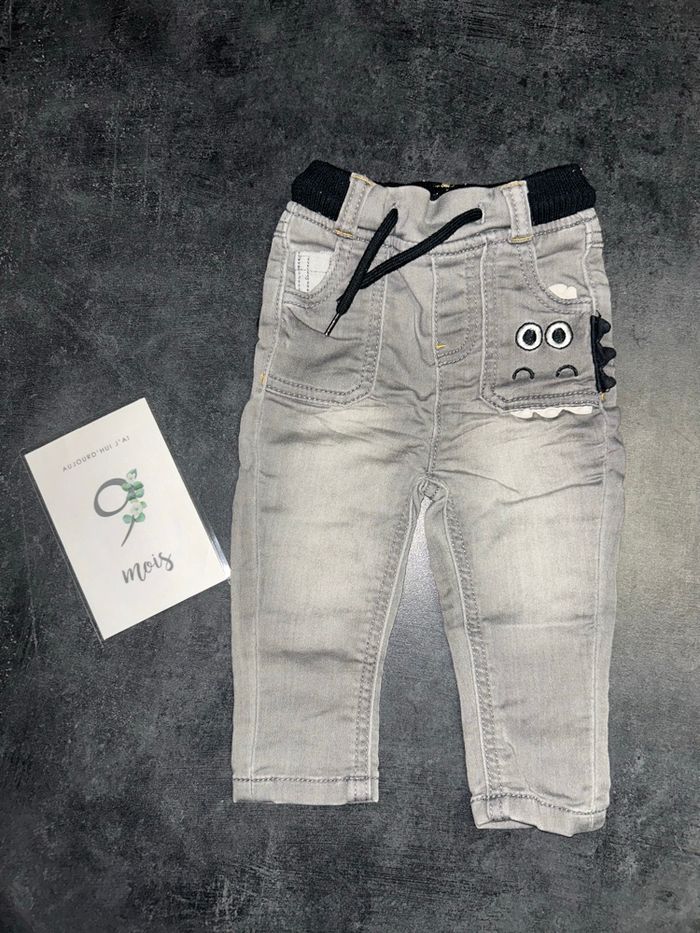 Jean bébé Couleur : gris Motif tête de Dino sur la poche avant et élément en reliefs Cordon à la taille Passage pour la ceinture Taille : 9 mois / 71 cm