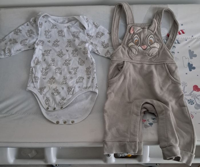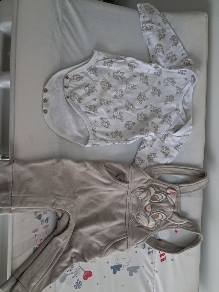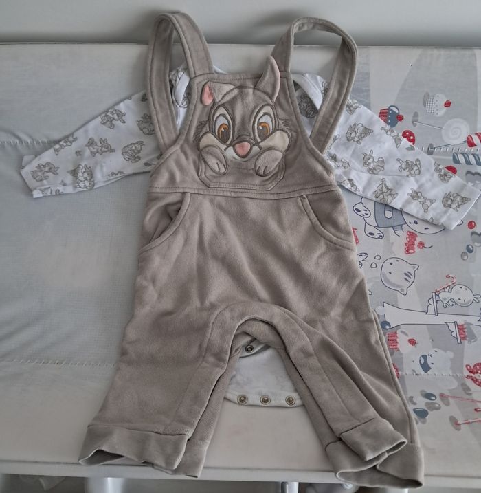 Jolie salopette Dsney Panpan de couleur beige- taupe avec son body blanc assorti. Taille 12 mois. Très peu porté et en très bon etat