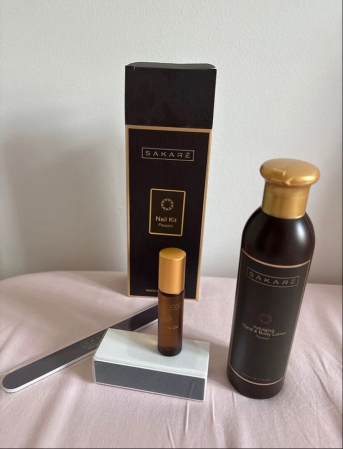 Soin ongles et mains. Neuf jamais utilisé dans son emballage d'origine. Marque anglaise. Nail kit complet / kit d'ongles composé d'une crème pour le corps et mains, d'une lime à ongle, d'un polissoir et d'une huile pour cuticules. Vendu sur le site Sakaré 138 euros En rupture de stock sur Amazon.