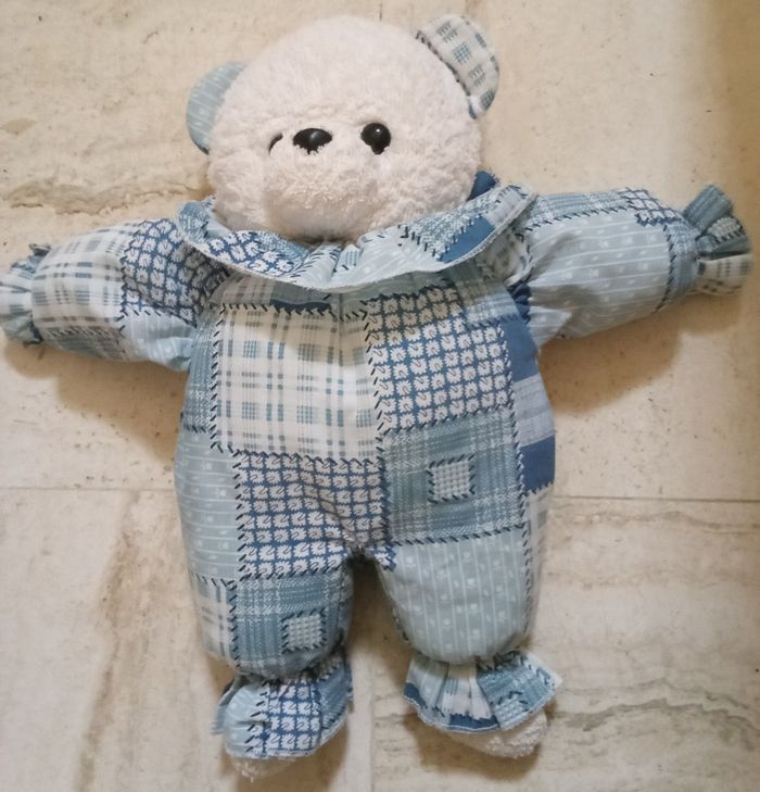 doudou peluche ours ourson blanc bleu vintage ancien vers 1997 presque 30 ans d'occasion la marque ? peut-être Minouche Ajena 36 cm +/- de haut couleur bleu et blanc tête tissu éponge bouclette
