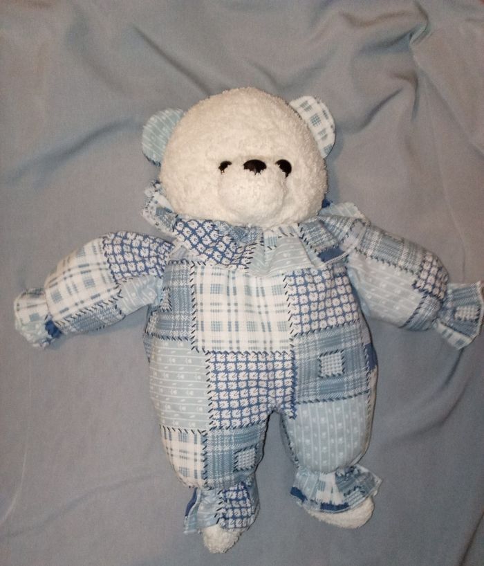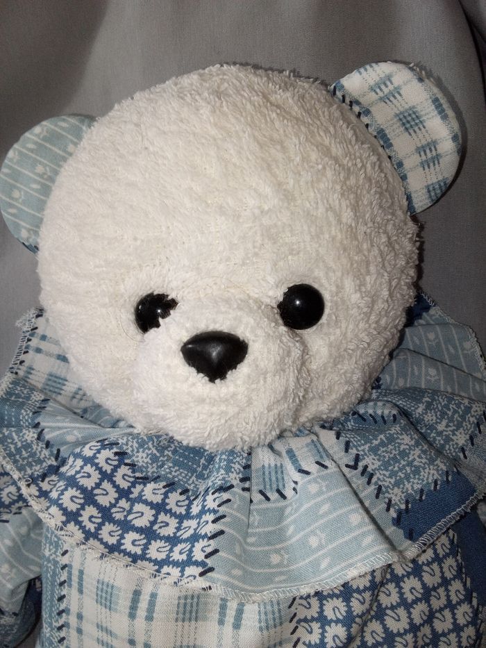doudou peluche ours ourson blanc bleu  vintage ancien vers 1997 presque 30 ans d'occasion la marque ? peut-être Minouche Ajena 36 cm +/- de haut couleur bleu et blanc  tête tissu éponge bouclette - photo numéro 2