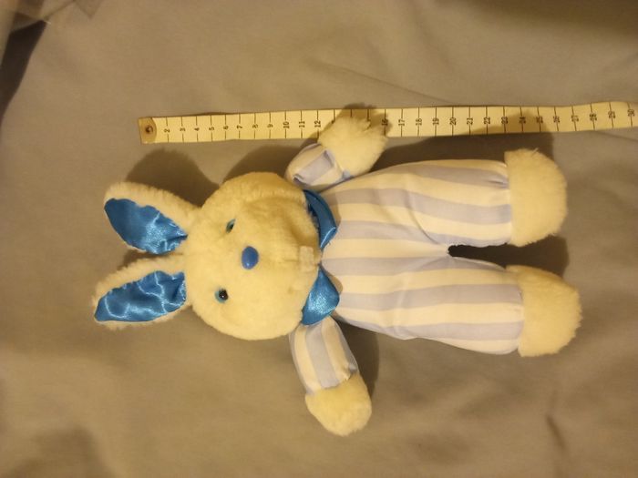 Doudou peluche lapin de la marque Pampers doudou vintage ancien de 1991 / 1993 il mesure 26 cm de haut voir la photoavec le mètre de couturière son corps est en tissu fin rayé rayures blanches blanc et bleues bleu clair col collerette tissu chiffon bleu satin brillant nez bleu clair en plastique pvc dur ses yeux sont durs en plastique il est d'occasion j'ai recousu / restauré où il en avait besoin Son étiquette a été coupée photos prises avec flash je peux en envoyer d'autres de jour corps en tissu style toile de parachute doudou est propre , il a été lavé pas de tache trou réparés tissu pas trop usé langue feutrine blanche doudou lapin lapine lapereau il peut ressembler à un chien son prix est de 24€ hors port et son prix est fixe svp merci