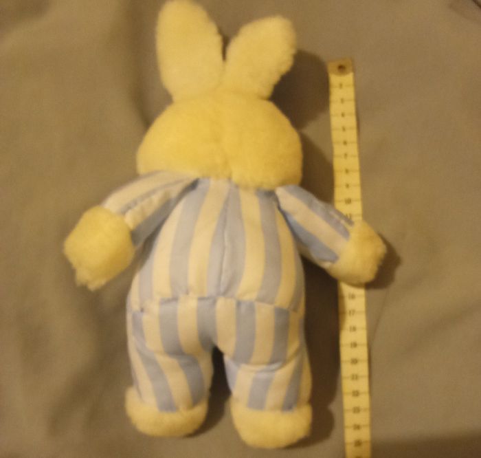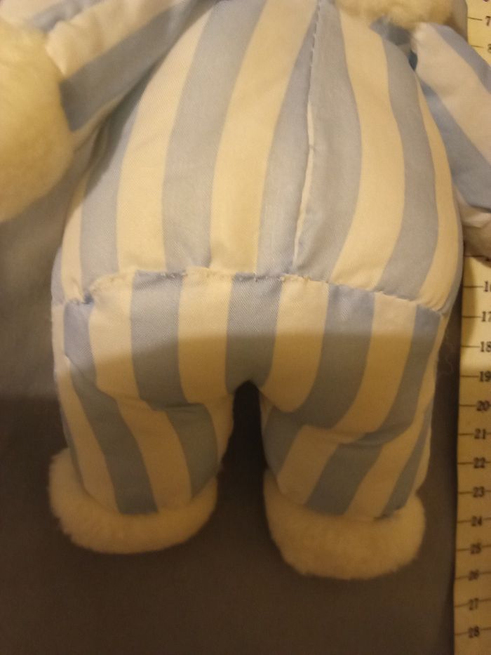 doudou peluche lapin vintage blanc et bleu clair rayures rayé de la marque Pampers d'occasion restauré par couture en posture debout 26cm +/- - photo numéro 4